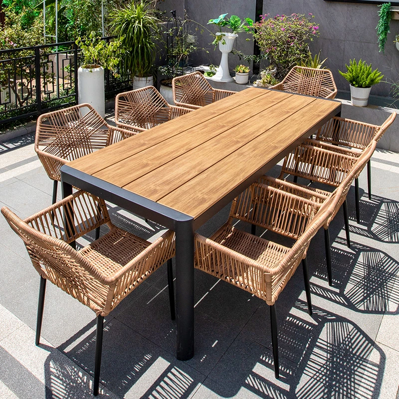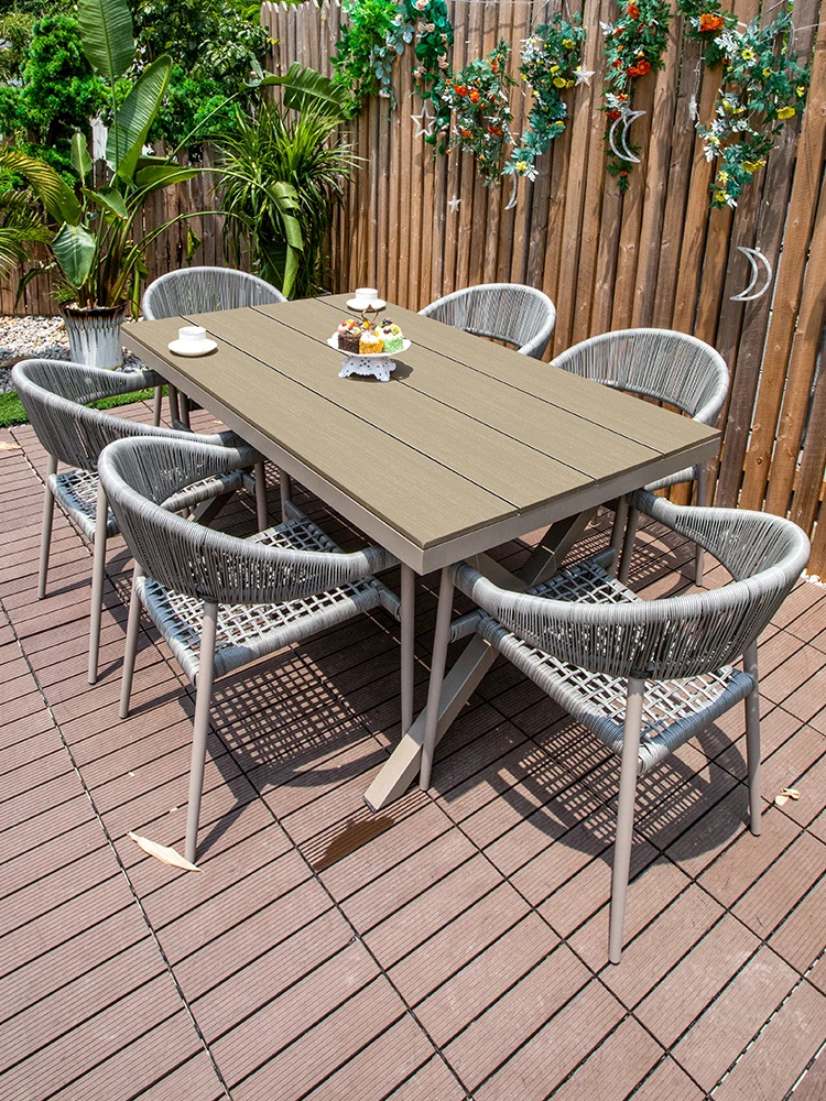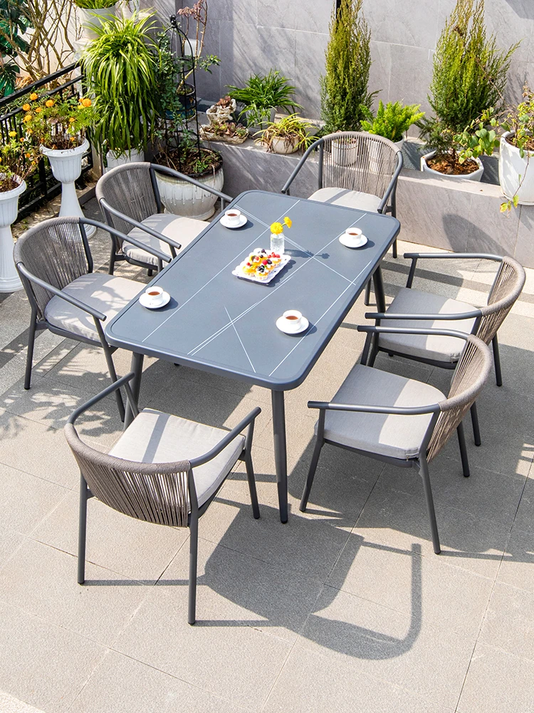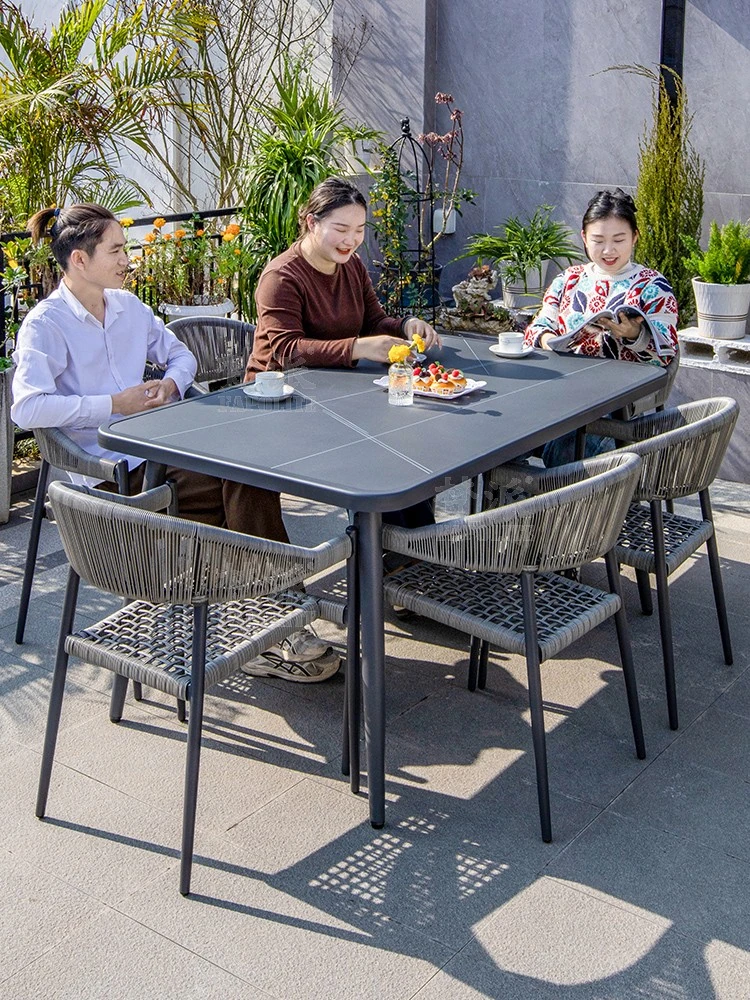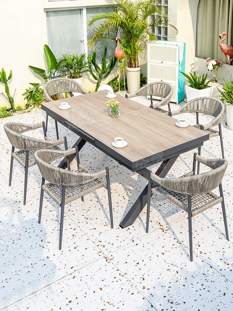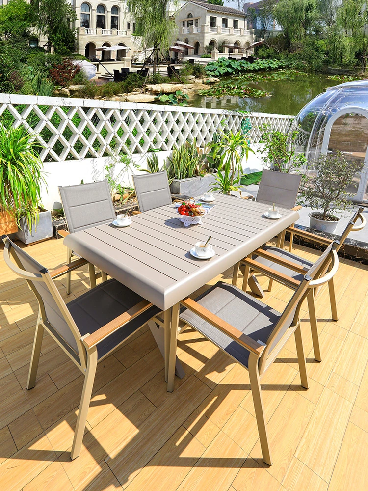 アウトドアアルミ合金テーブルセット - エレガントな長テーブルとチェアの組み合わせで、庭やテラスに最適!リラックスできる空間を演出し、ヴィラやガーデンにぴったりの屋外家具。快適なひとときをお楽しみください!