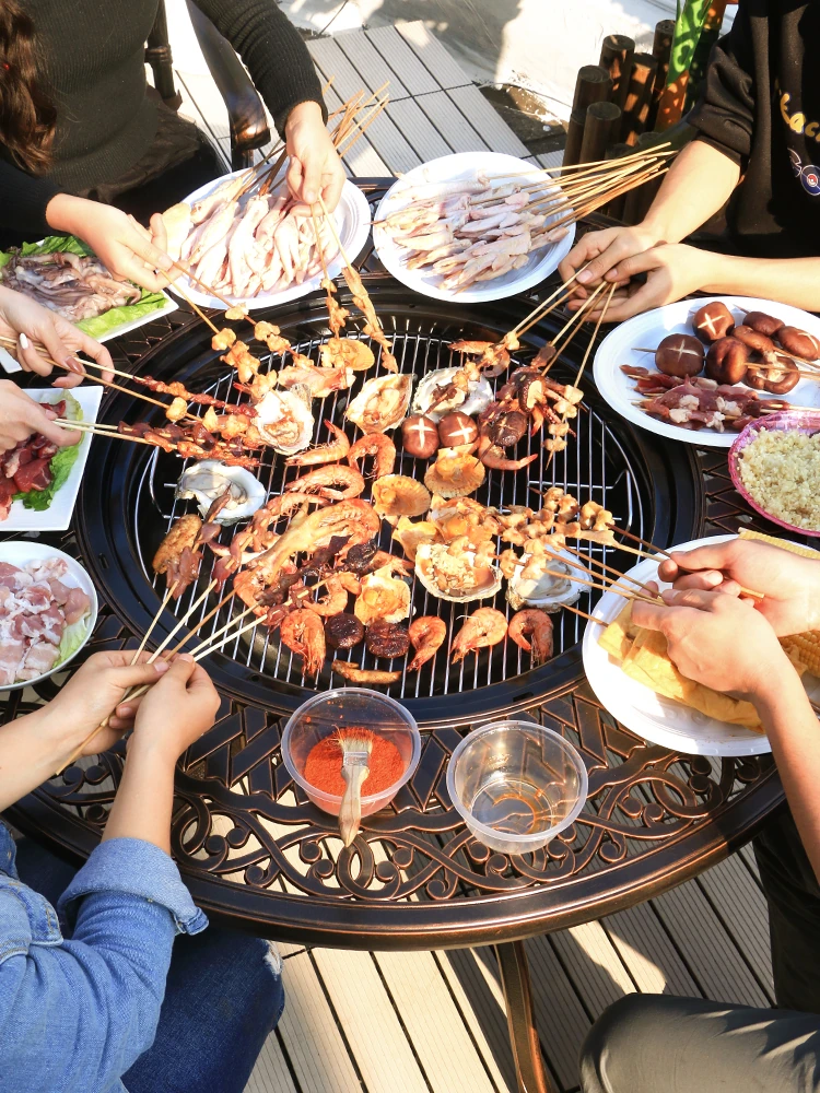 アウトドア BBQ テーブル & チェアセット - 電気と炭火の2WAY!庭やバルコニー、別荘に最適な屋外用バーベキューテーブル。友達や家族との楽しいひとときを演出します!