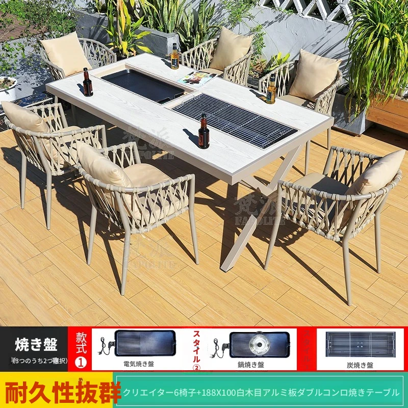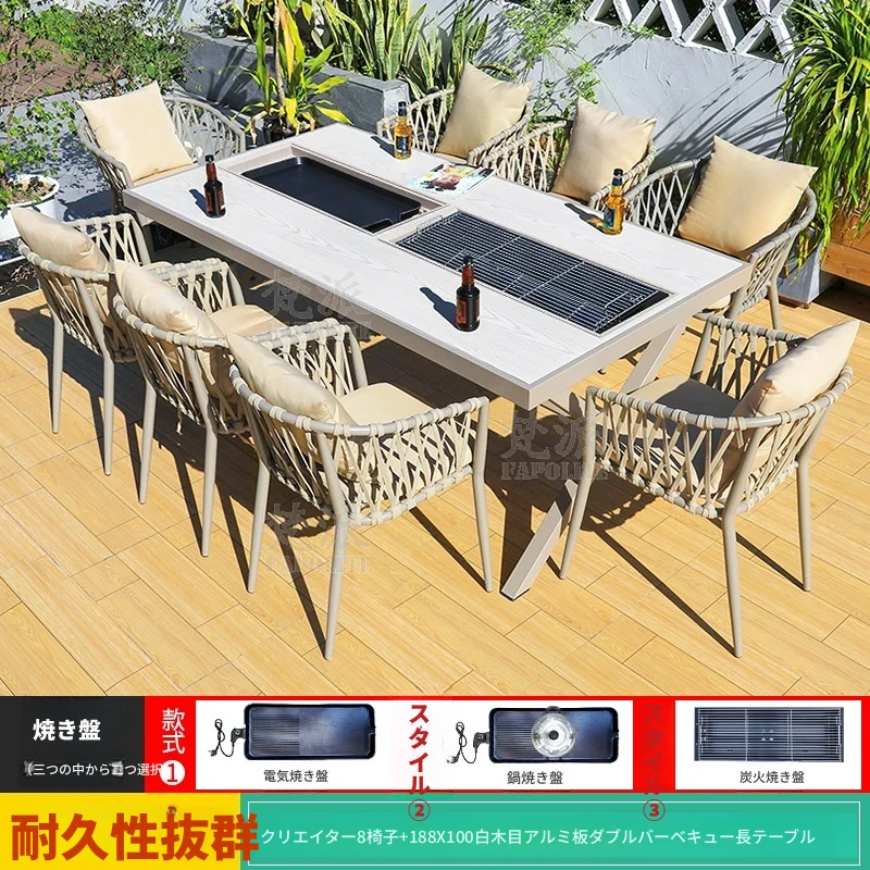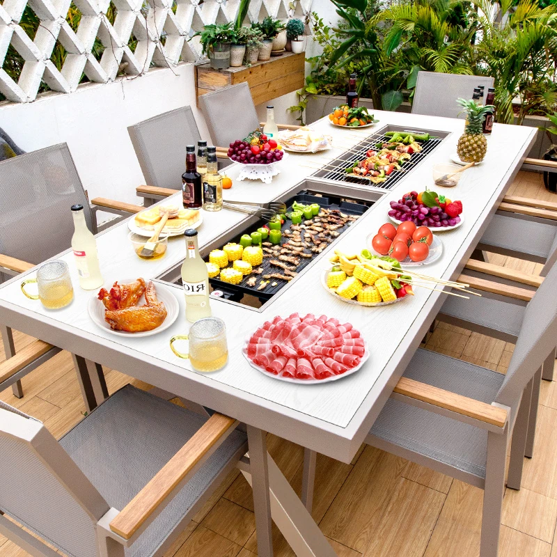 アウトドアバーベキューテーブル&チェアセット - ヴィラや商業向け、煙の出ない炭火&電気グリル用の高品質アルミニウム製、3~5点セットで庭先のBBQを楽しもう!