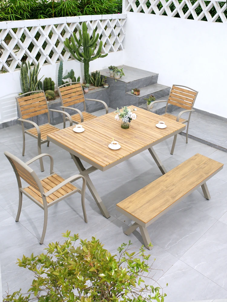 モダンでシンプルな屋外ダイニングテーブルセット!日差しを気にせず楽しめるアルミ合金と樹脂木製の庭用テーブルと椅子。リラックスしたテラスでのひとときを演出します。