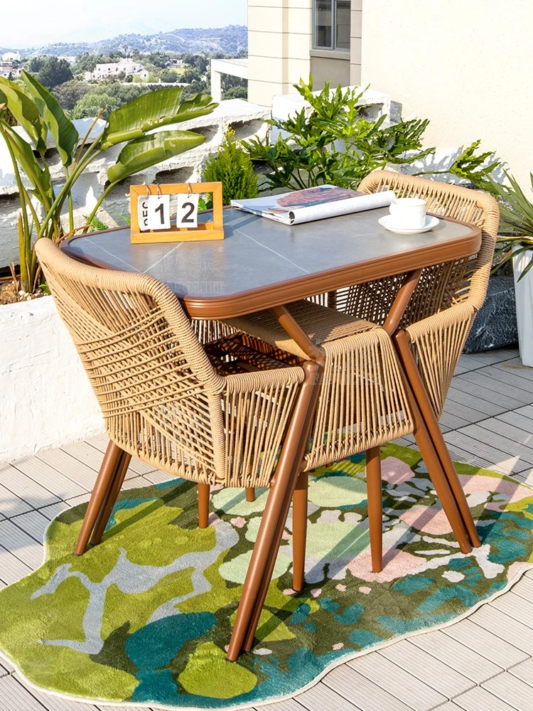 ヴァンパイ・アウトドアテーブル&チェアセット - ヴィラの庭やカフェに最適!リラックスできる背もたれ付きのラタンチェアと耐久性のあるプラスチックウッドテーブル。おしゃれな屋外空間を演出し、友人や家族とのひとときを楽しむための完璧なアイテムです。