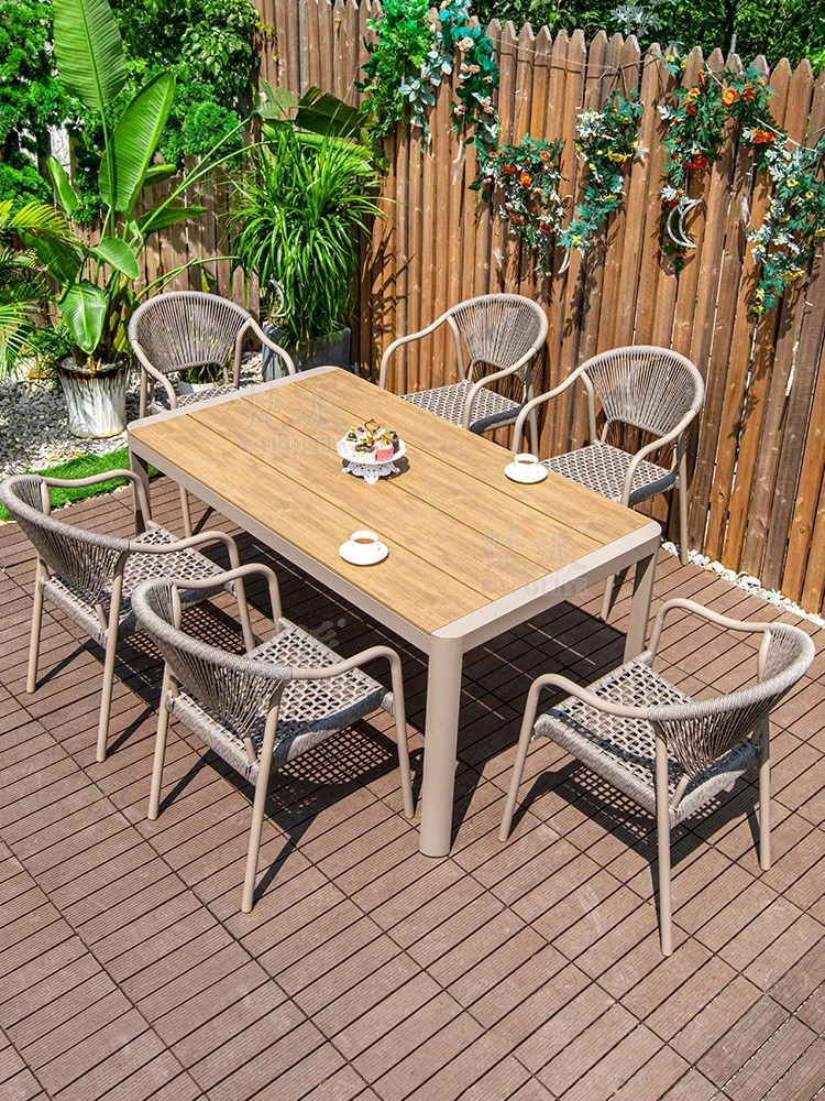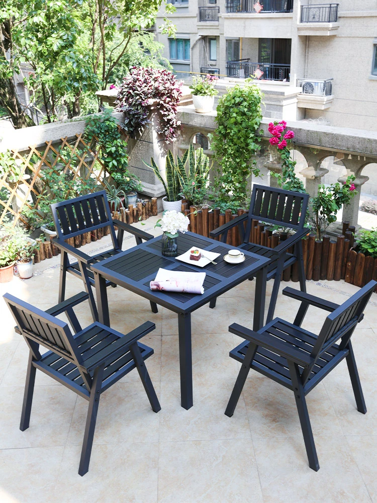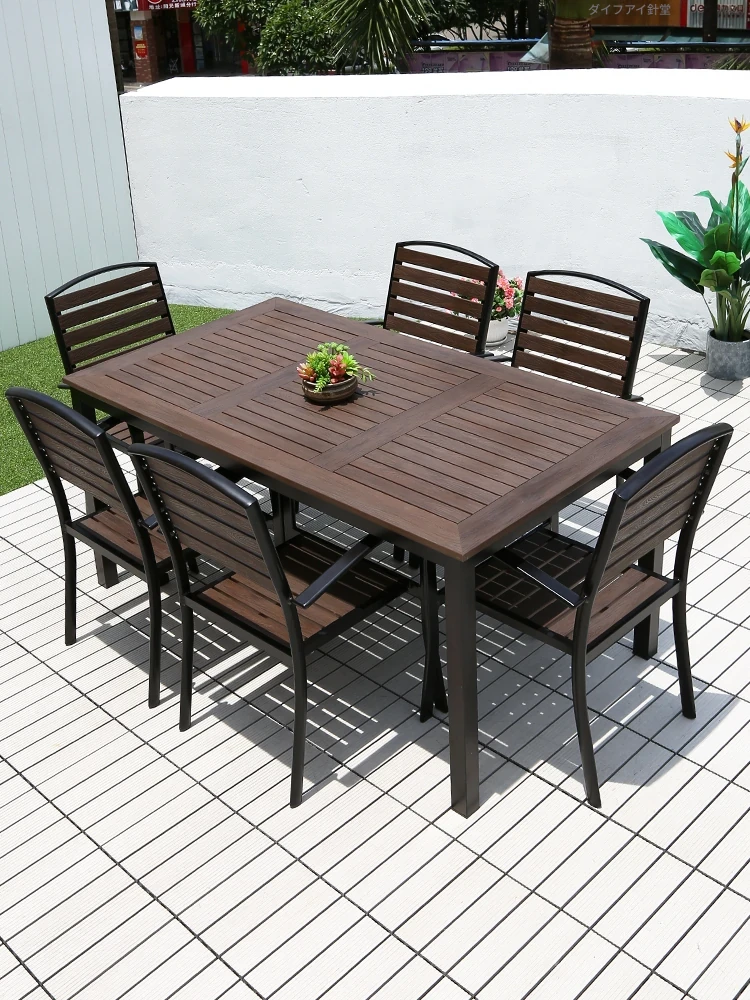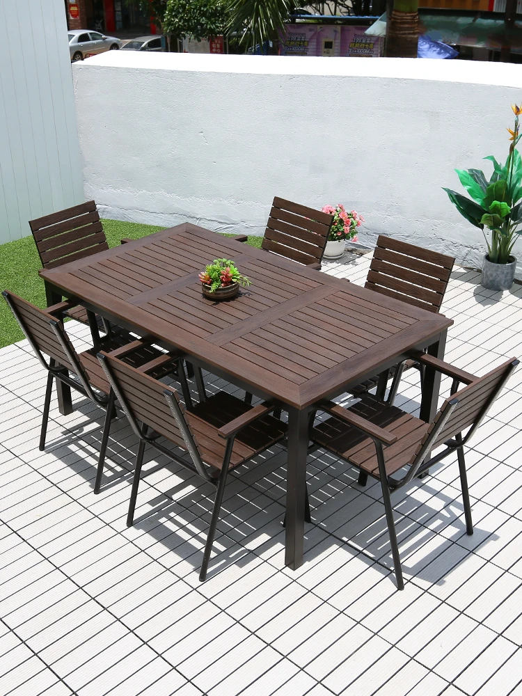 アウトドア用アルミ合金とプラスチック木材の防腐コンビネーション、スタイリッシュな別荘庭園テラス用テーブルとチェア、シンプルでリラックスできる鉄製デザイン!あなたの庭をもっと魅力的に!
