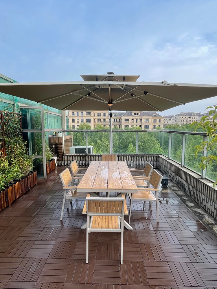 防水・耐候性抜群!おしゃれなプラスチックウッド製アウトドアテーブル&チェアセット - バルコニーや庭に最適なパラソル付きアイアン家具で、快適なリラックス空間を演出します。