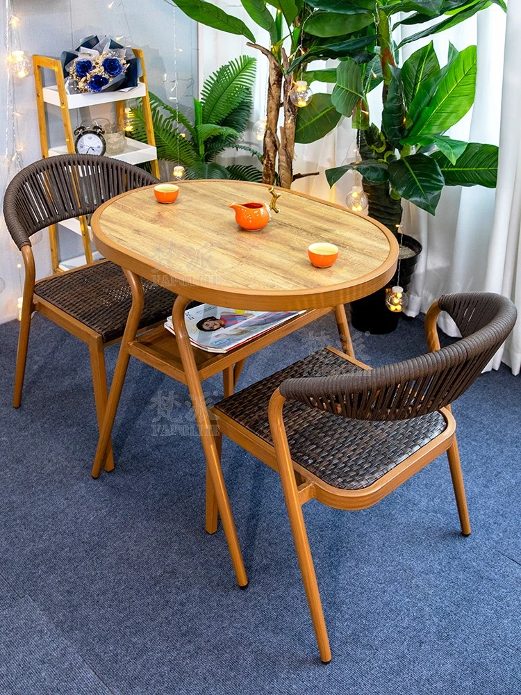 アウトドアプラスチックウッドテーブルセット - 防水アルミ合金製、耐腐食性で長持ち!ガーデンやバルコニーに最適なリラックス空間を演出。別荘スタイルの快適な屋外家具をお楽しみください!