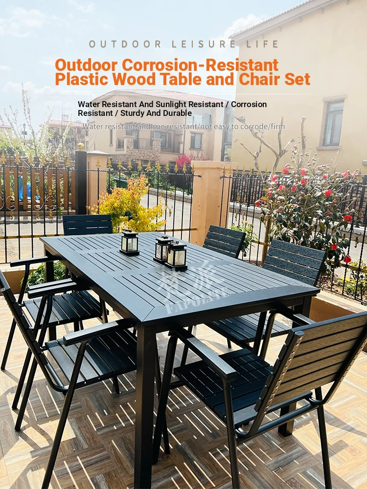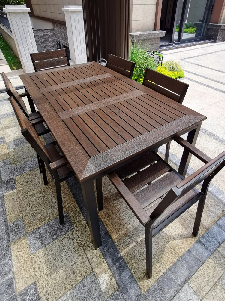 Outdoor Plastic Wood Dining Table Set - Elegant Long Table for Patio, Balcony, and Villa. Waterproof and Sun-Resistant Furniture for Your Garden or Terrace. Perfect for Relaxed Outdoor Dining!