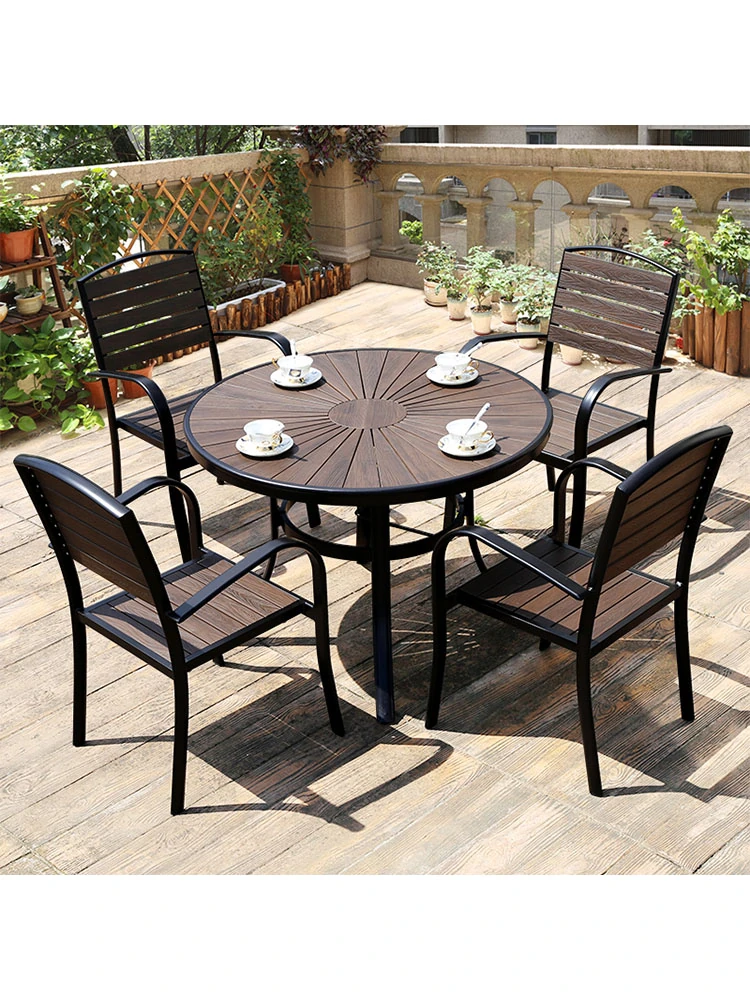 Outdoor Plastic-Wood Dining Set: Carbon Steel Round and Rectangular Tables with Commercial-Grade Armchairs – Waterproof and Stylish Furniture Combo for Patios and Restaurants