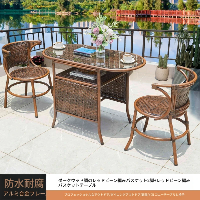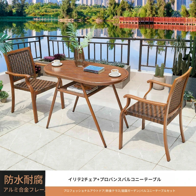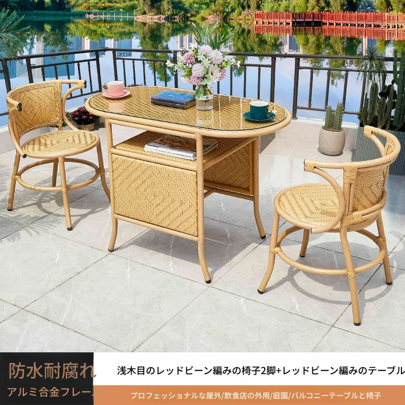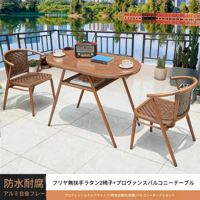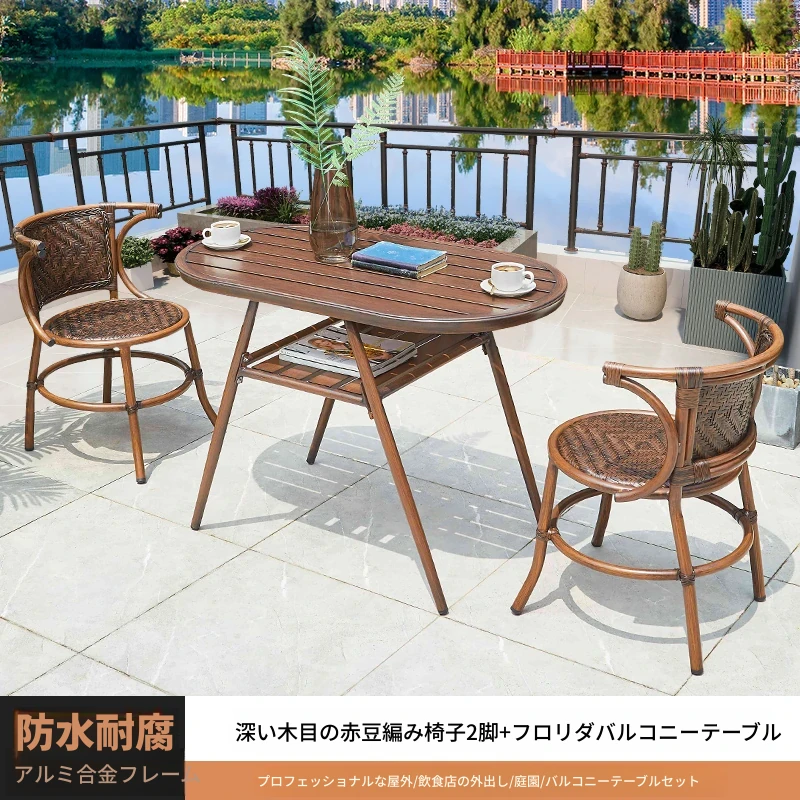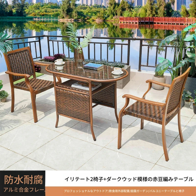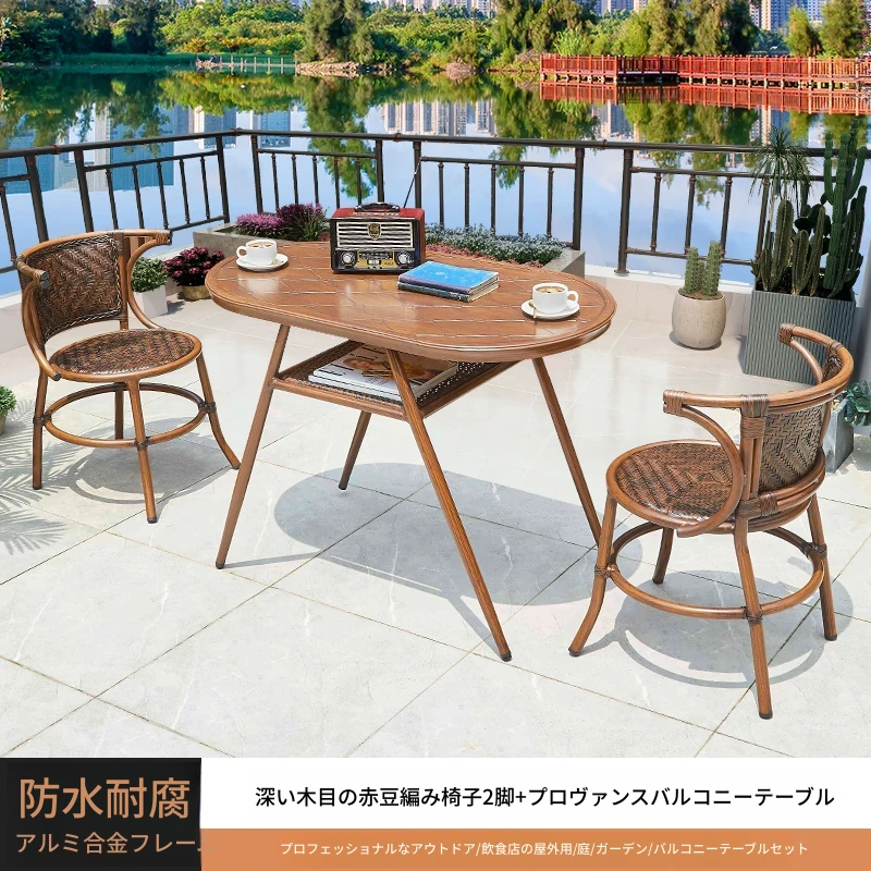 バルコニー用3点セット!防水仕様のアルミ合金製テーブルと藤編みの椅子で、庭や屋内外でのリラックスタイムを楽しもう。おしゃれで機能的、あなたの空間を彩る完璧なアイテムです!