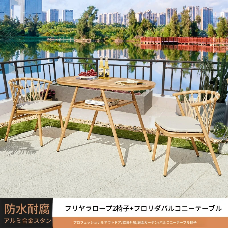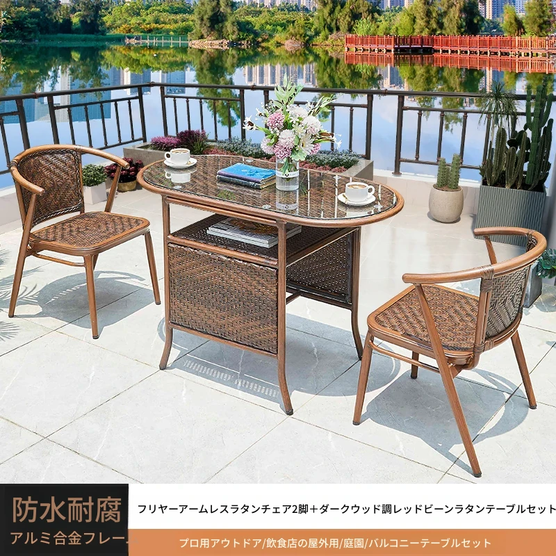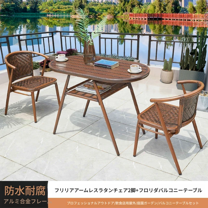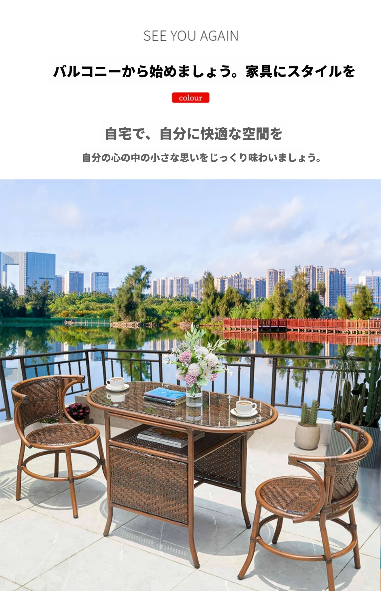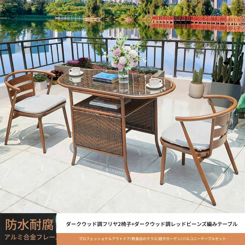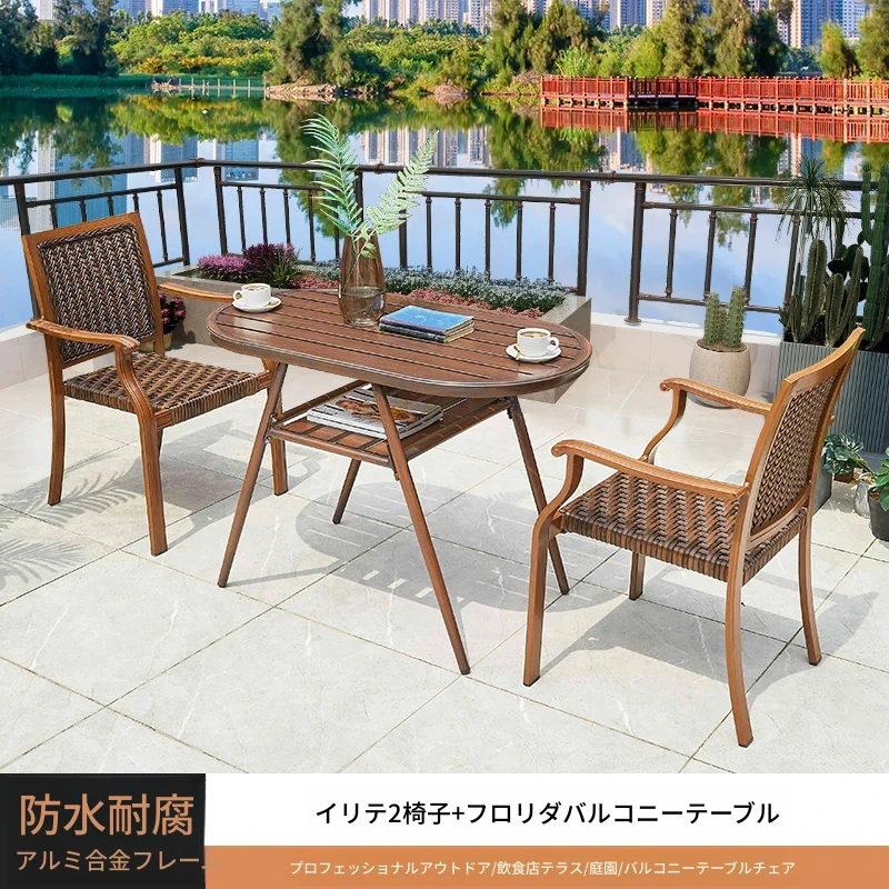 バルコニー用3点セット!防水仕様のアルミ合金製テーブルと藤編みの椅子で、庭や屋内外でのリラックスタイムを楽しもう。おしゃれで機能的、あなたの空間を彩る完璧なアイテムです!
