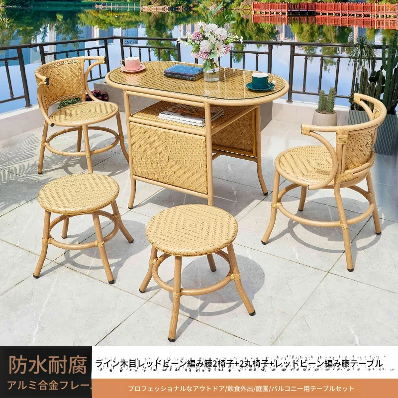 【深木纹】レッドビーン編み椅子2脚+2つの丸いスツール+プロバンステーブル 【深木纹】レッドビーン編み椅子2脚+2つの丸いスツール+プロバンステーブル