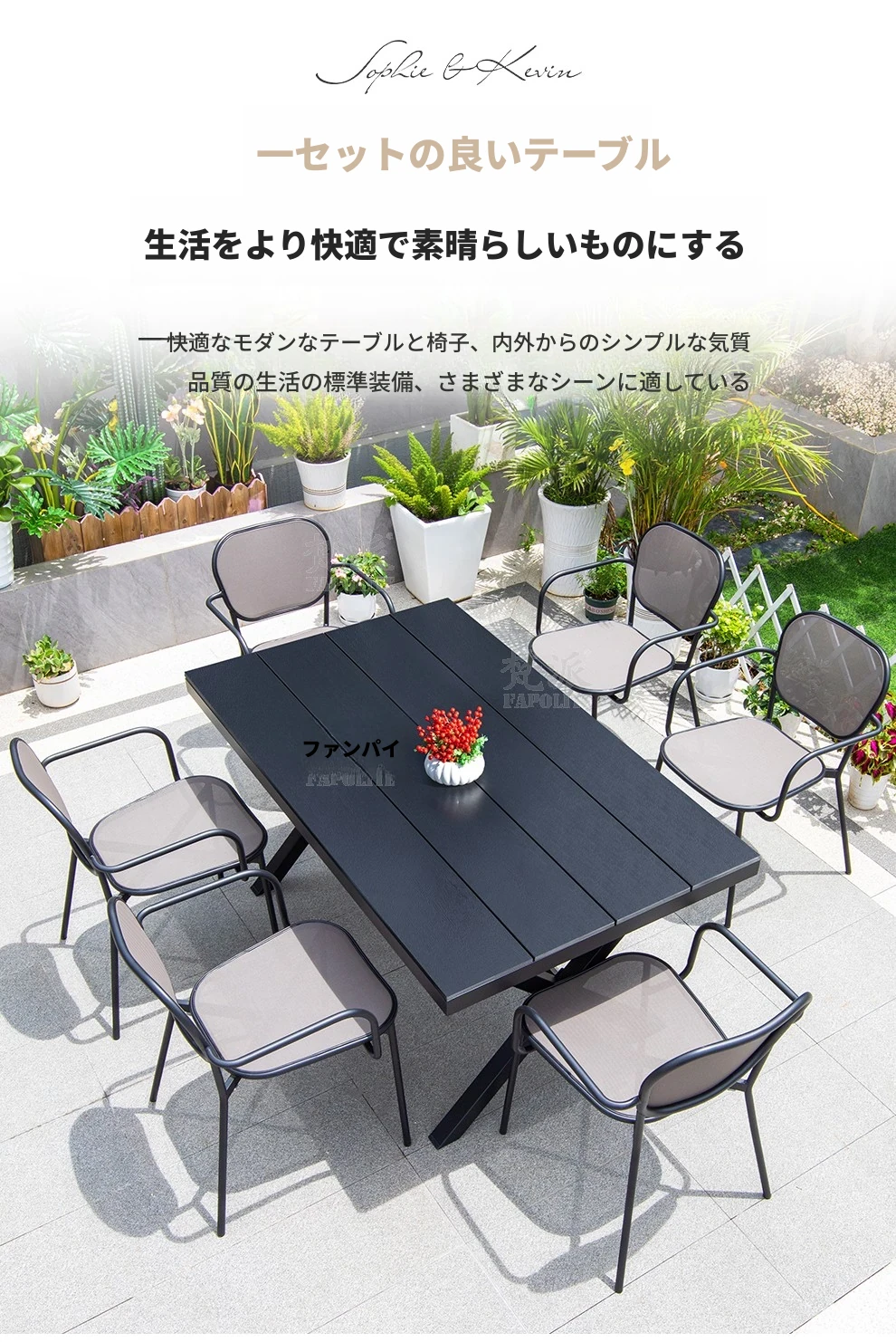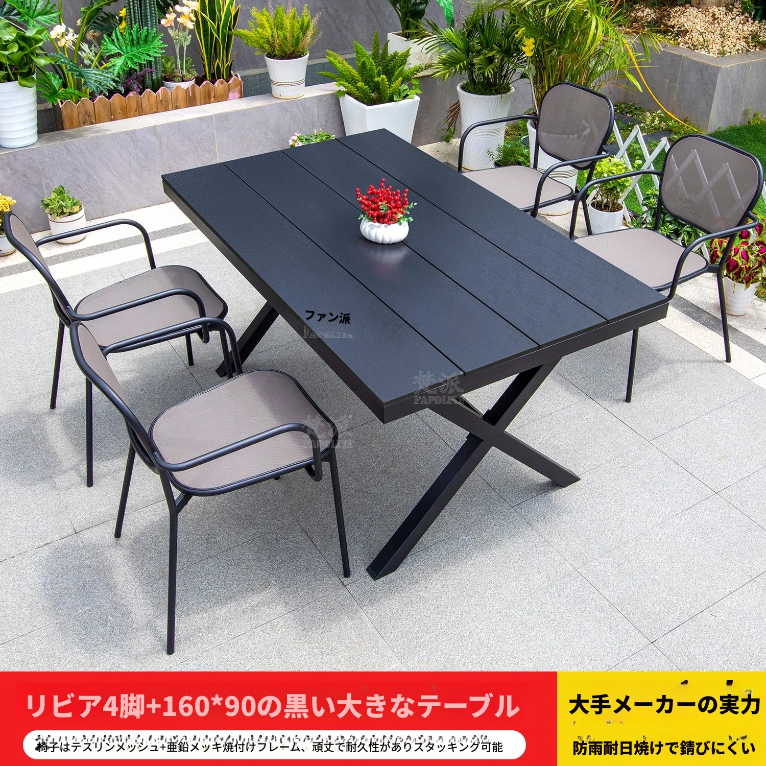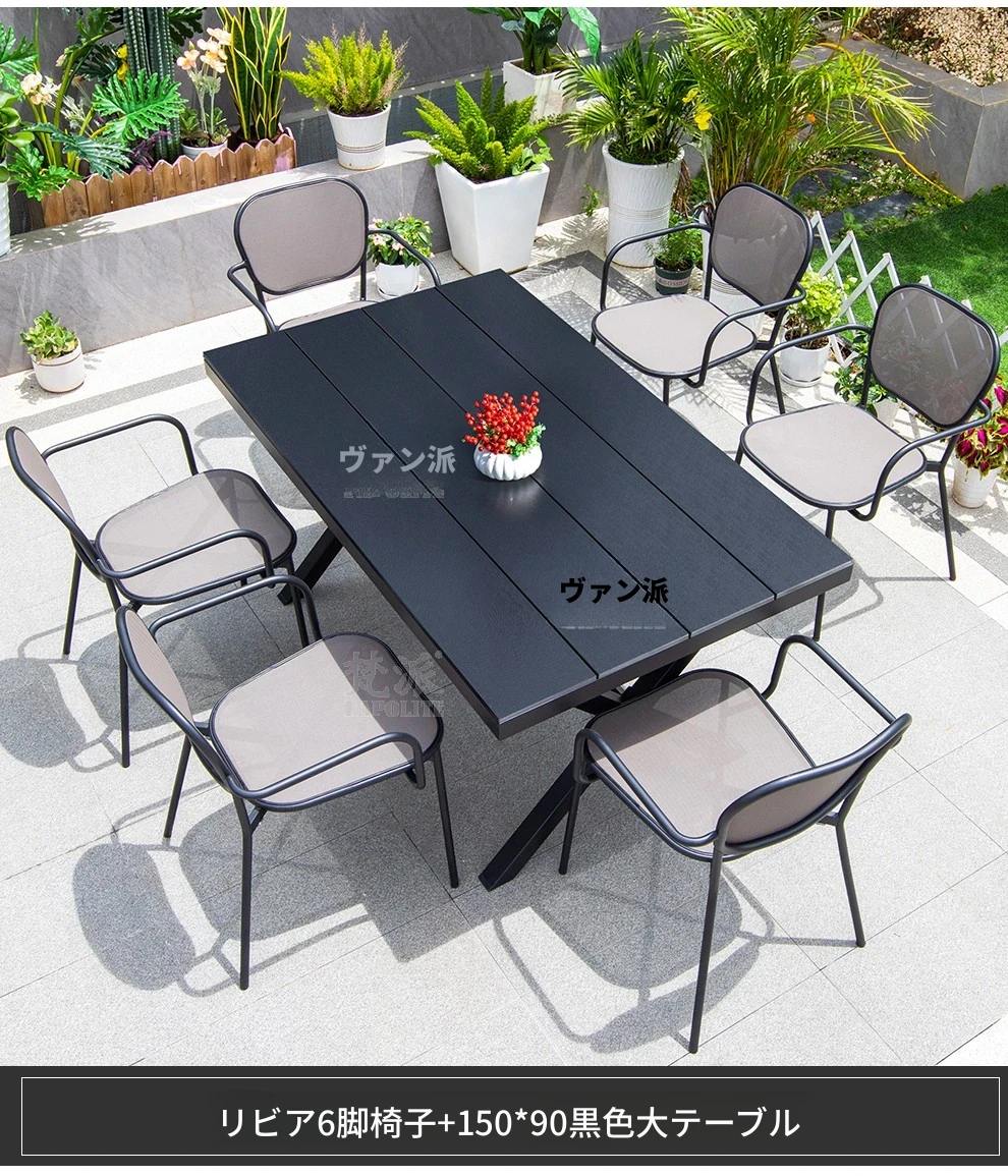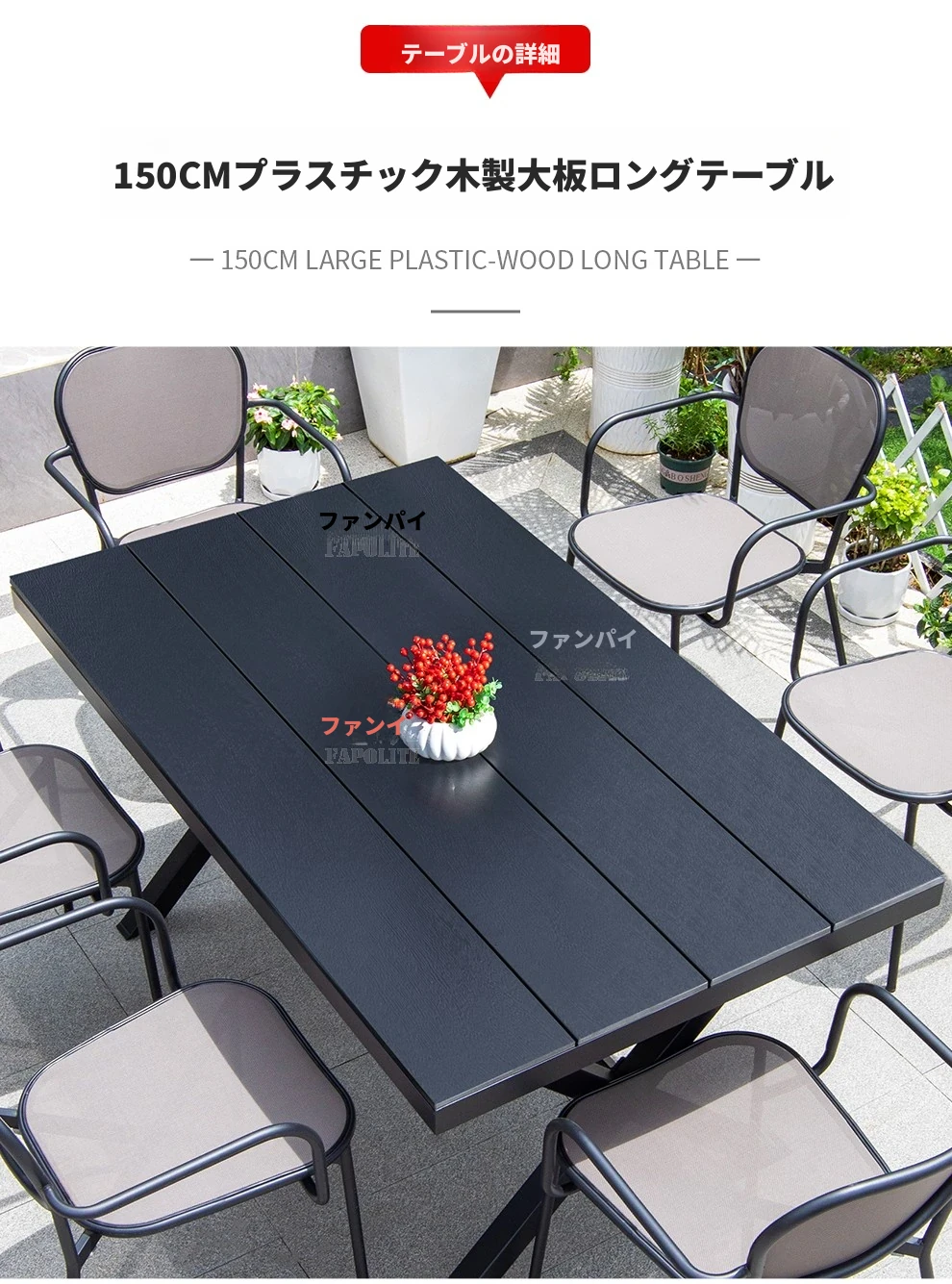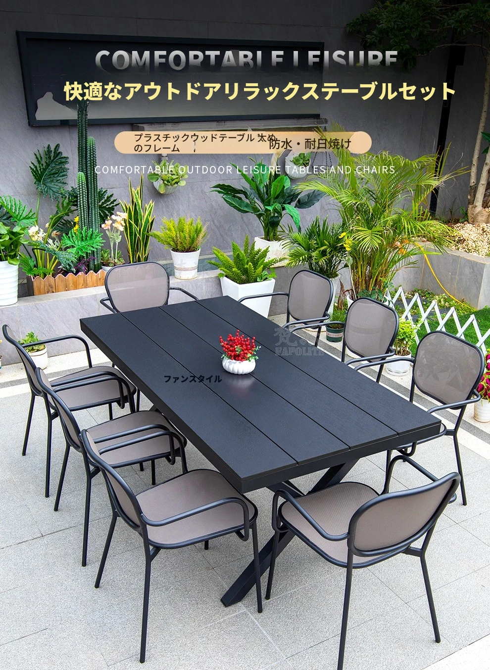 アウトドア用プラスチック木材テーブルセット!耐久性に優れたカーボンスチール製のアイアンテーブルと背もたれ付きの商業用椅子の組み合わせ。防水仕様で、どんな天候でも安心してご使用いただけます。おしゃれで機能的なデザインで、庭やバルコニーに最適です!