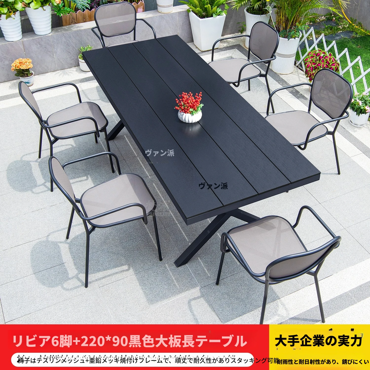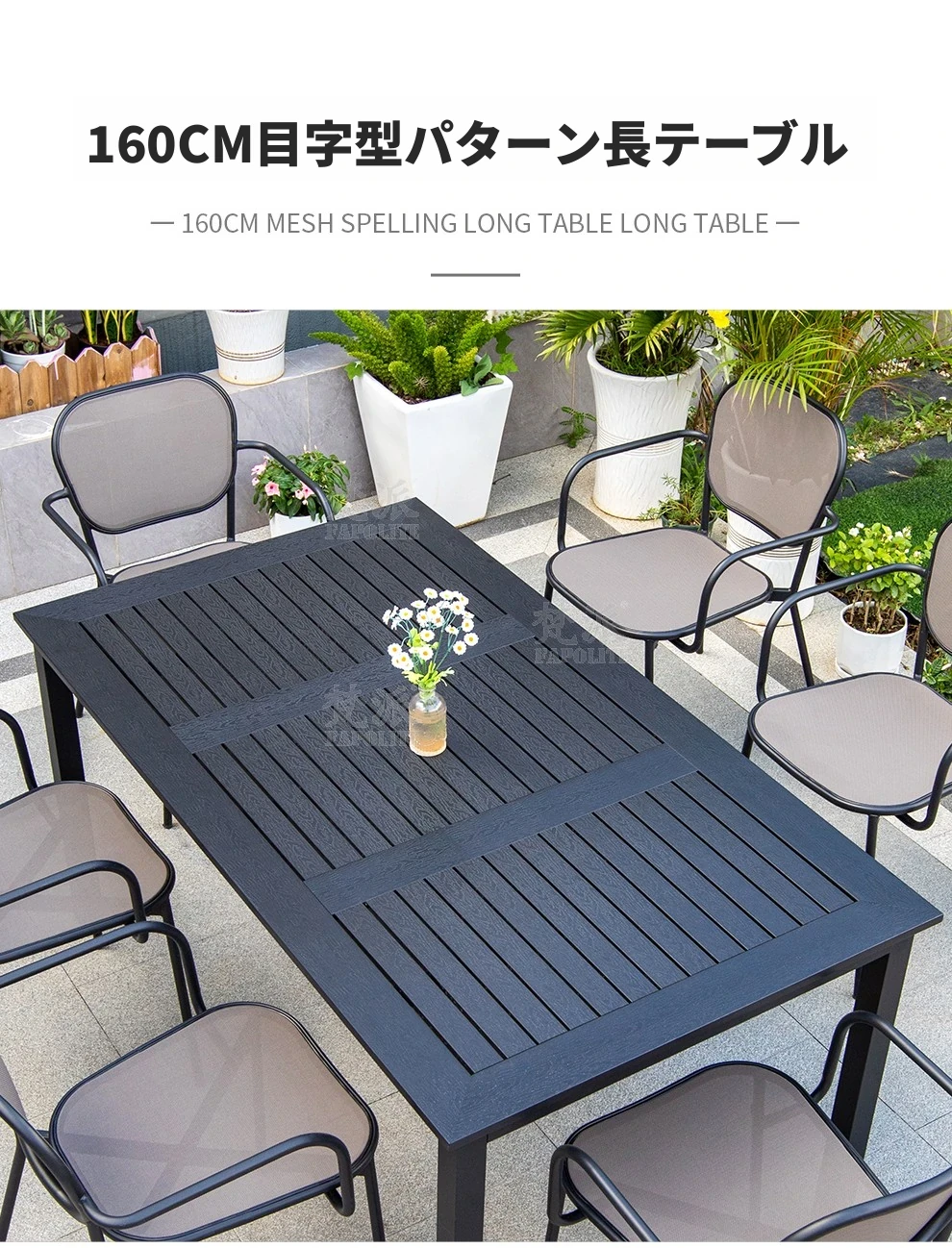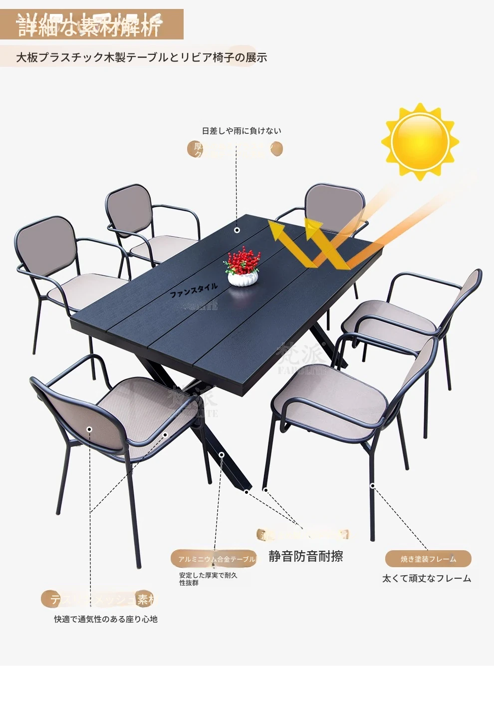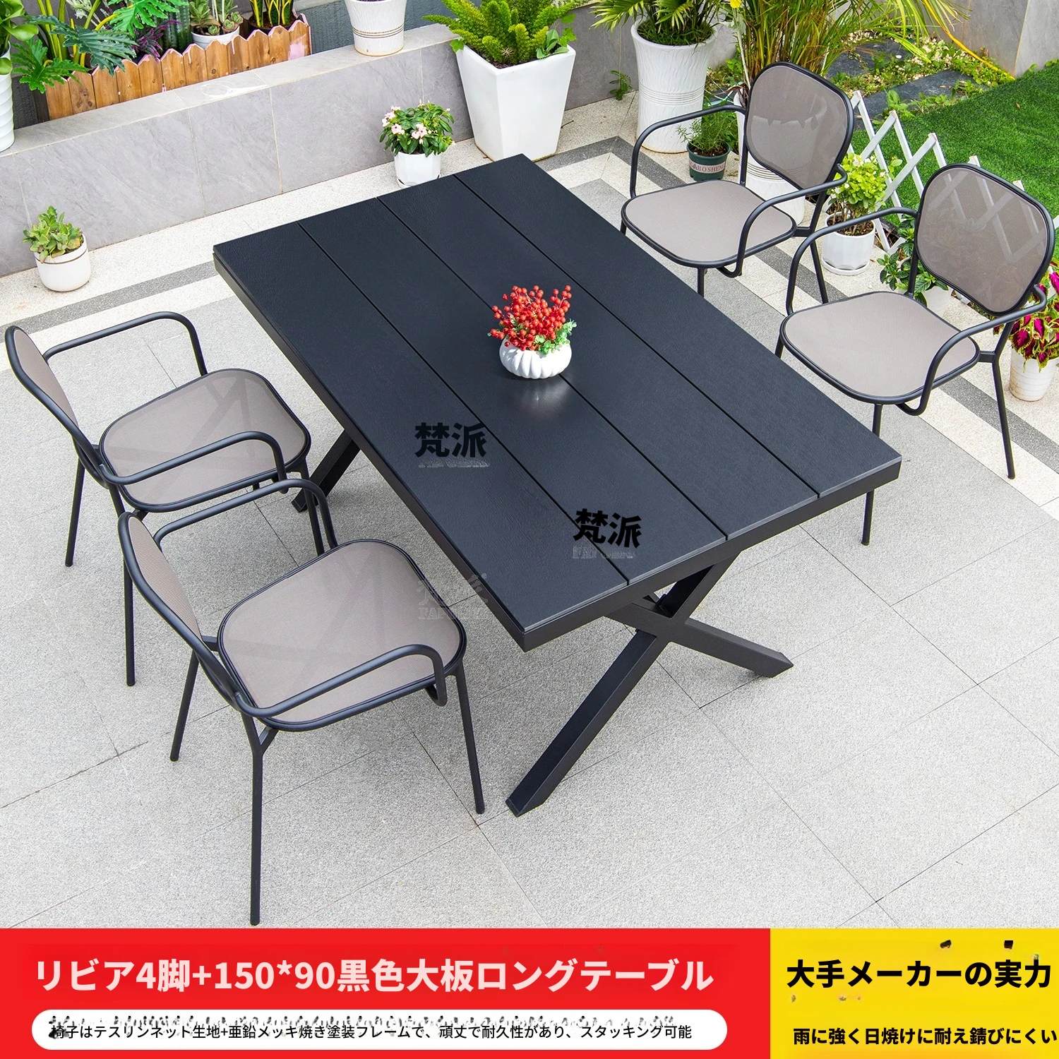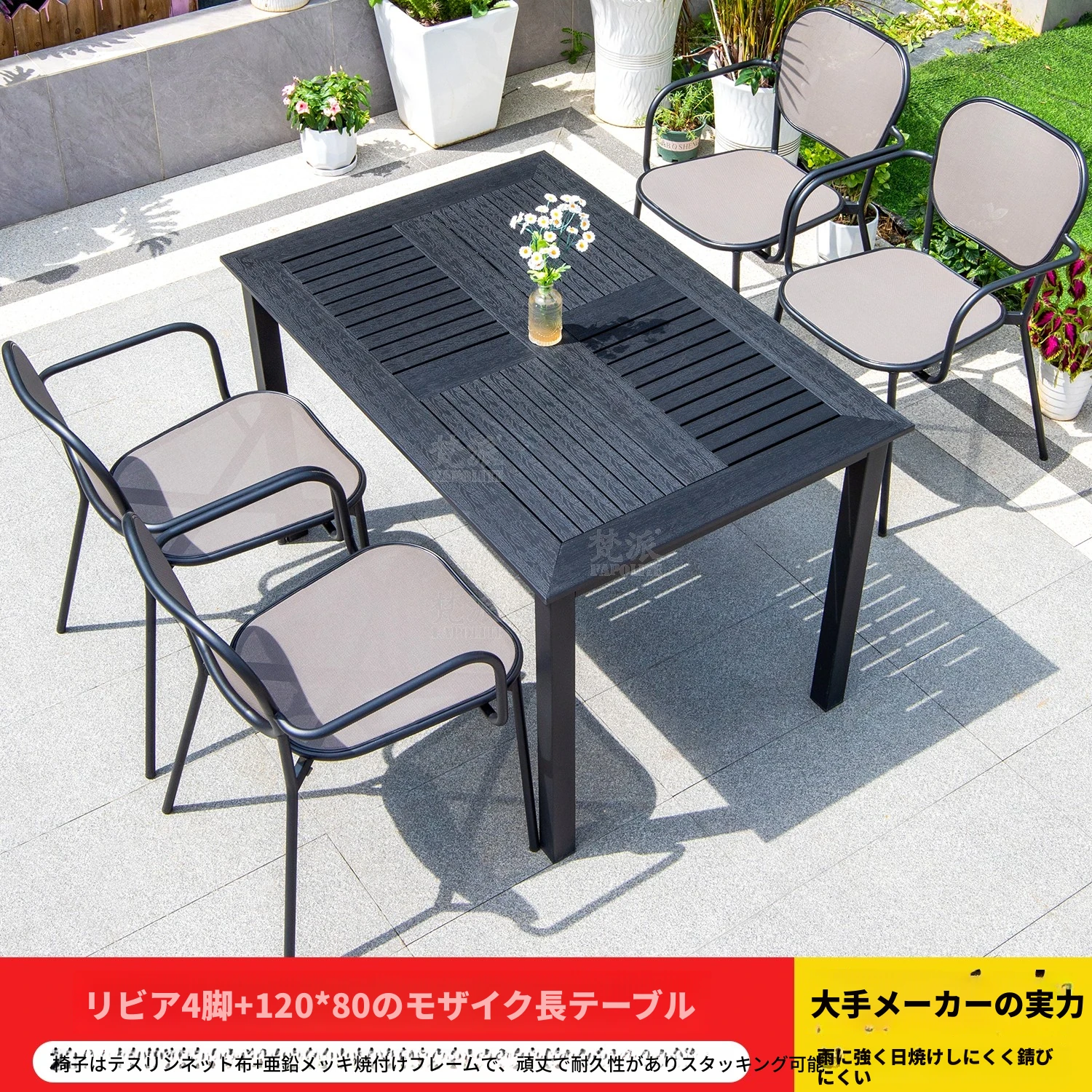 アウトドア用プラスチック木材テーブルセット!耐久性に優れたカーボンスチール製のアイアンテーブルと背もたれ付きの商業用椅子の組み合わせ。防水仕様で、どんな天候でも安心してご使用いただけます。おしゃれで機能的なデザインで、庭やバルコニーに最適です!