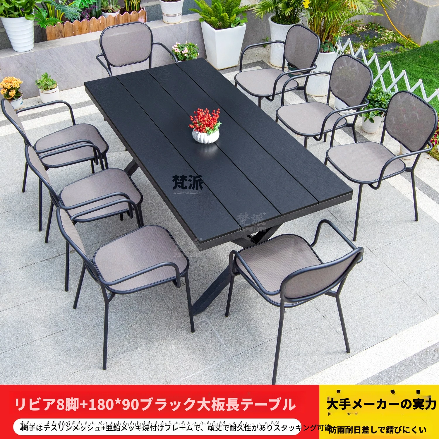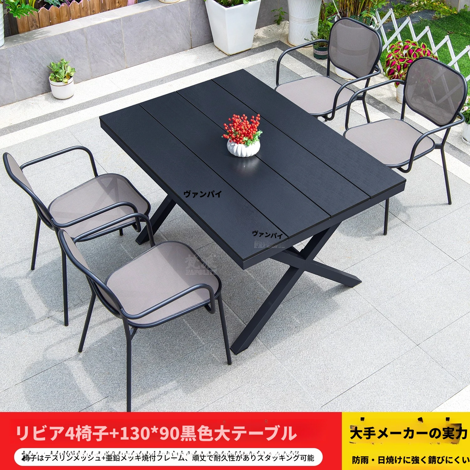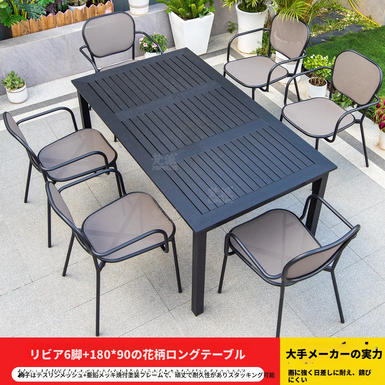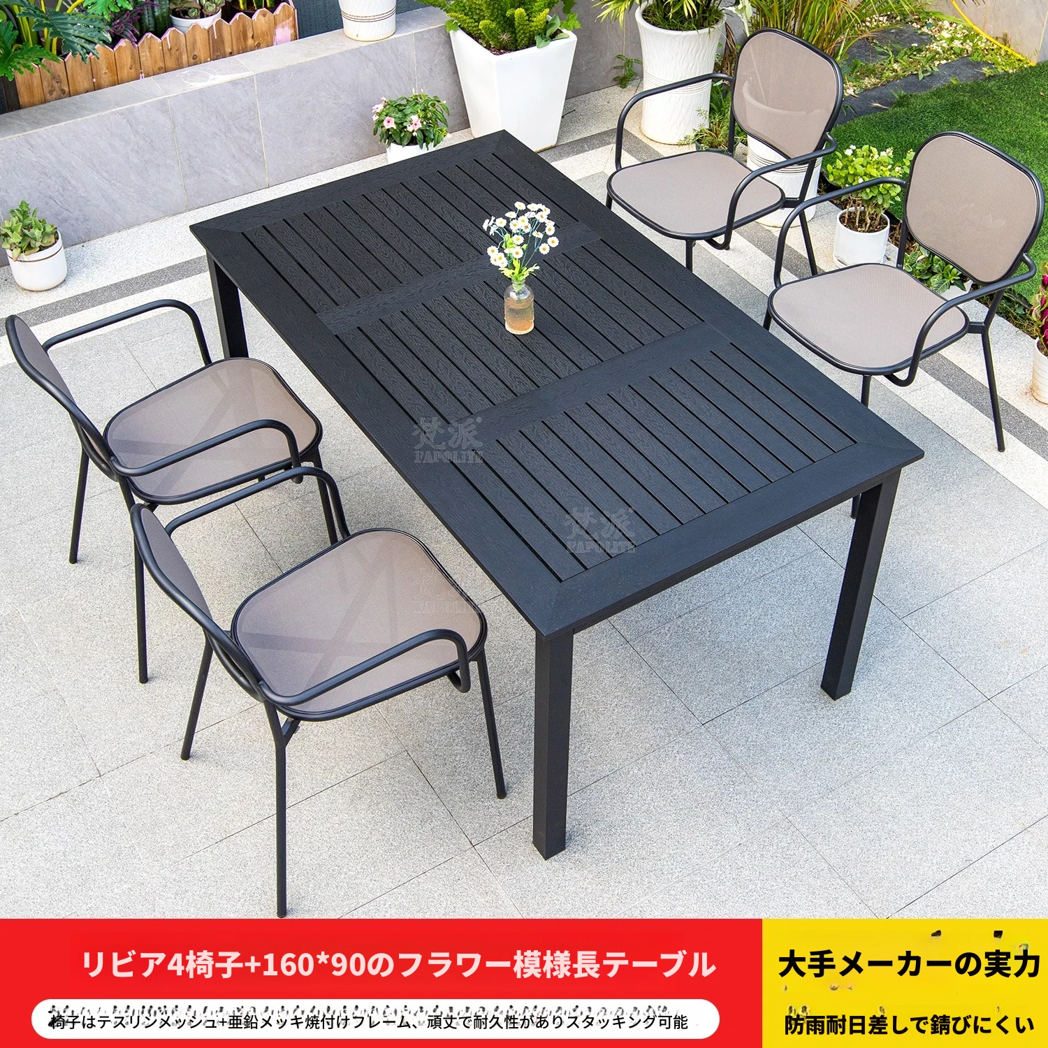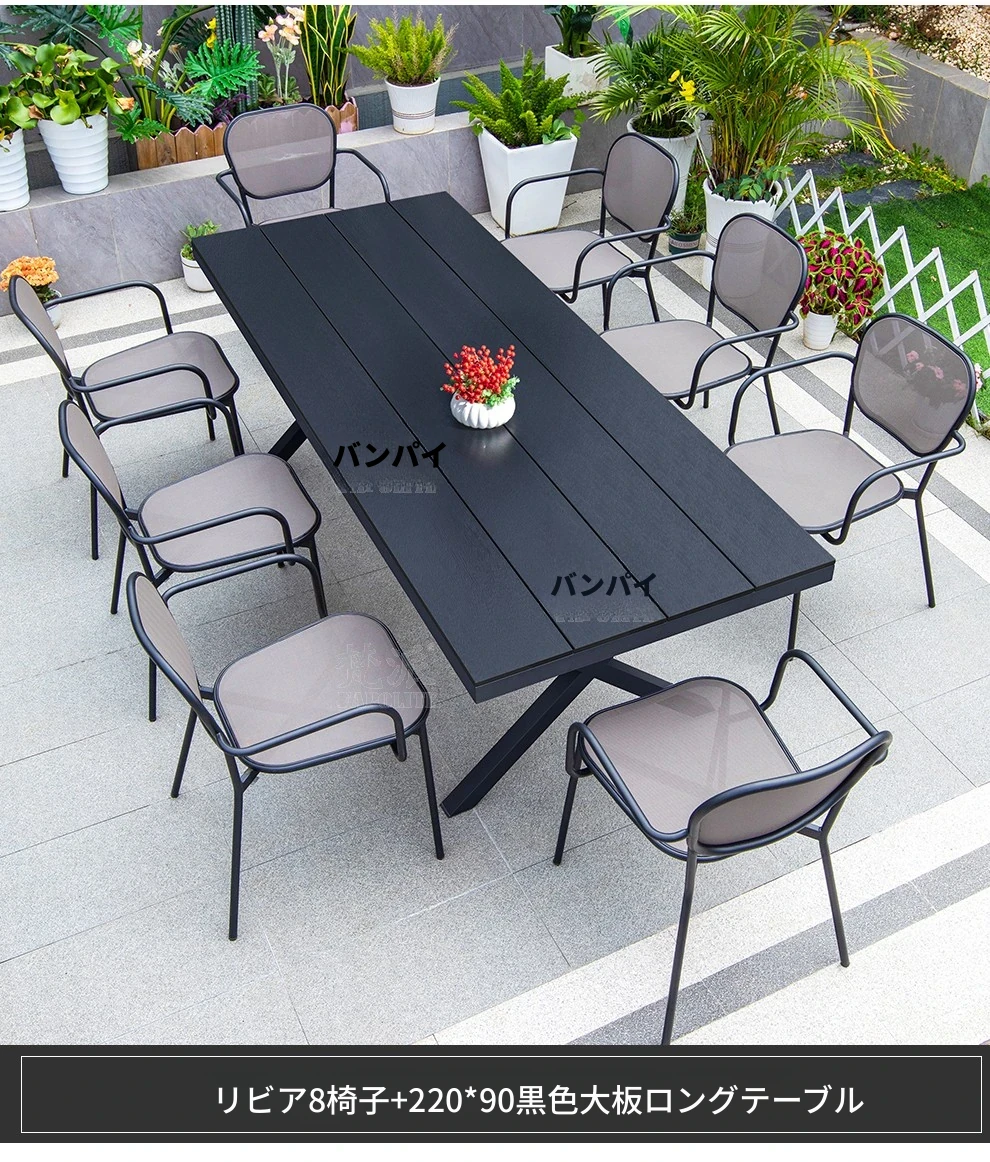 アウトドア用プラスチック木材テーブルセット!耐久性に優れたカーボンスチール製のアイアンテーブルと背もたれ付きの商業用椅子の組み合わせ。防水仕様で、どんな天候でも安心してご使用いただけます。おしゃれで機能的なデザインで、庭やバルコニーに最適です!