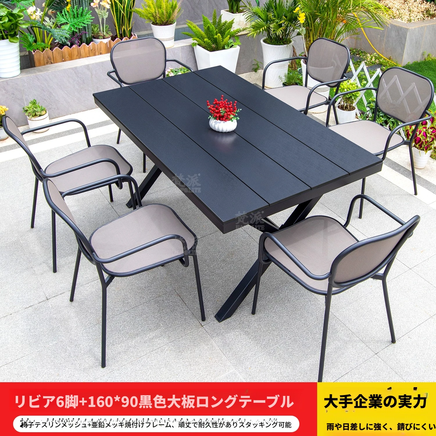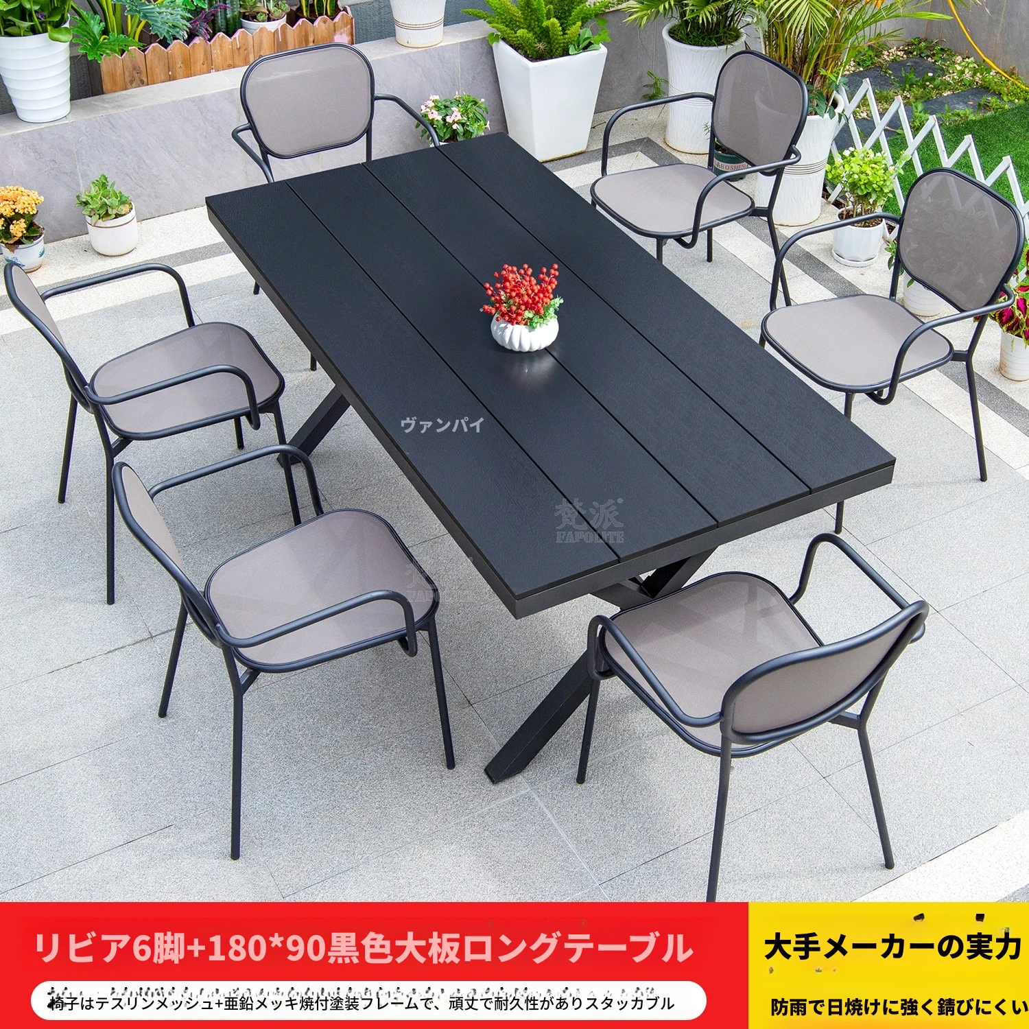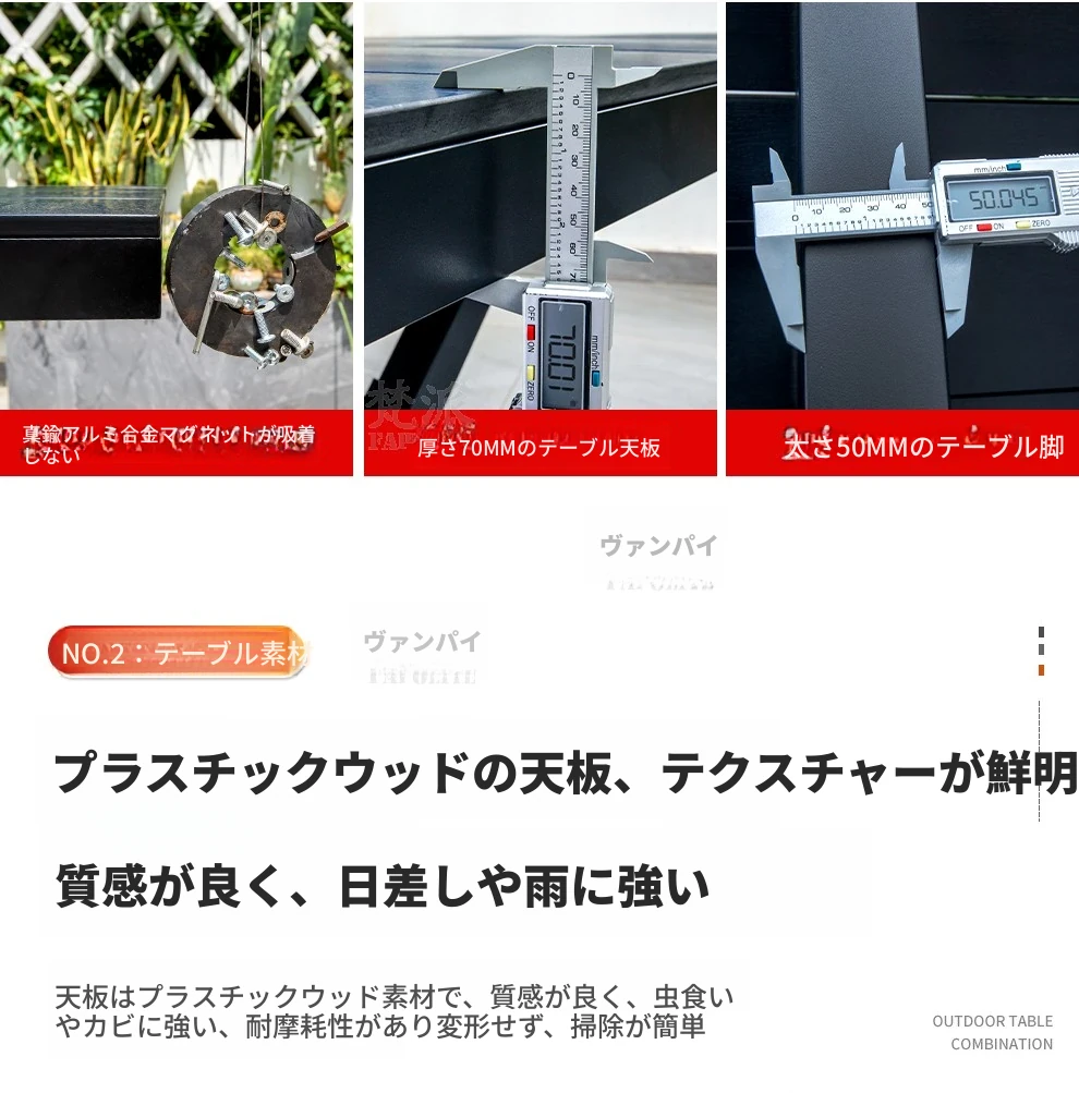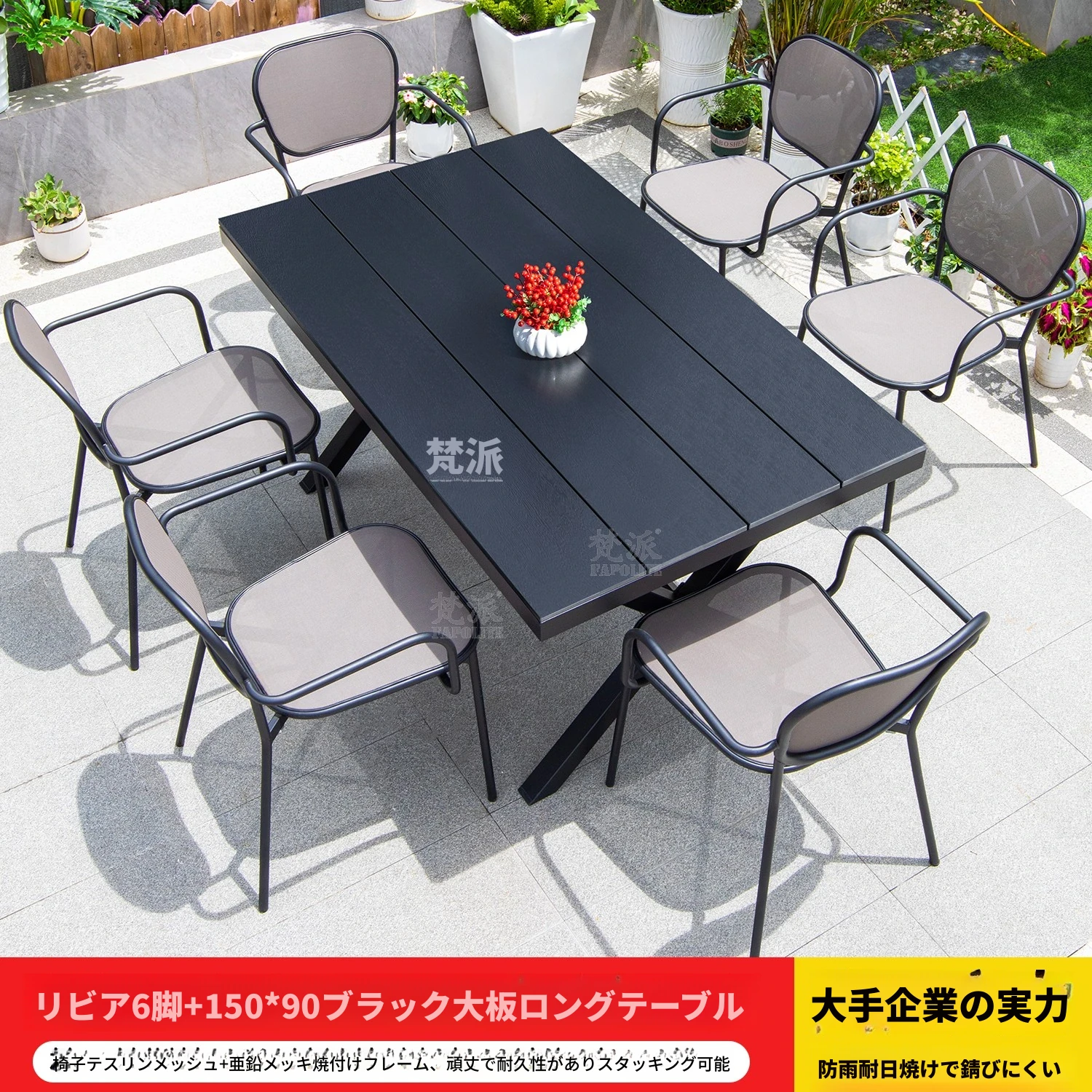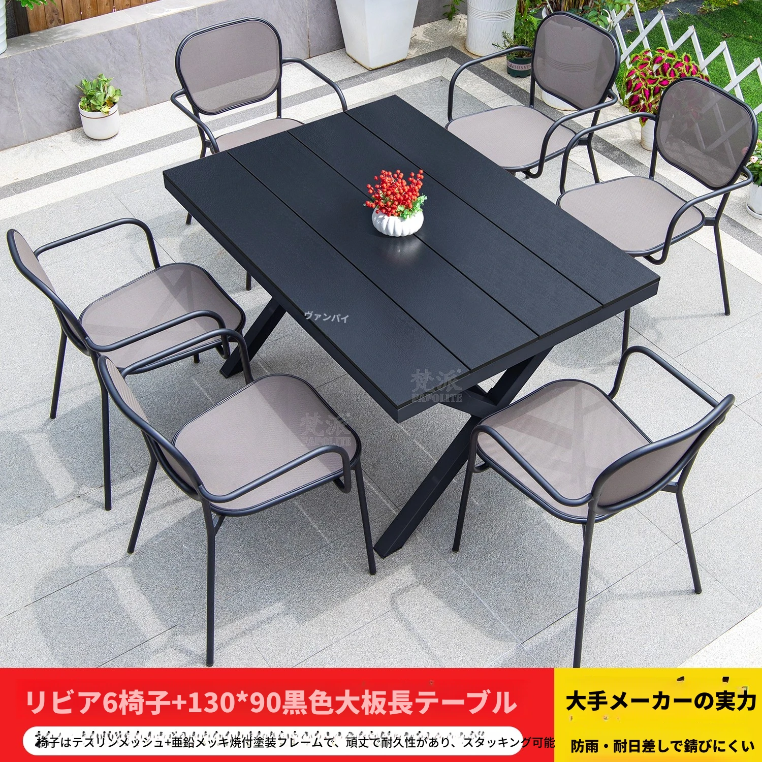 アウトドア用プラスチック木材テーブルセット!耐久性に優れたカーボンスチール製のアイアンテーブルと背もたれ付きの商業用椅子の組み合わせ。防水仕様で、どんな天候でも安心してご使用いただけます。おしゃれで機能的なデザインで、庭やバルコニーに最適です!
