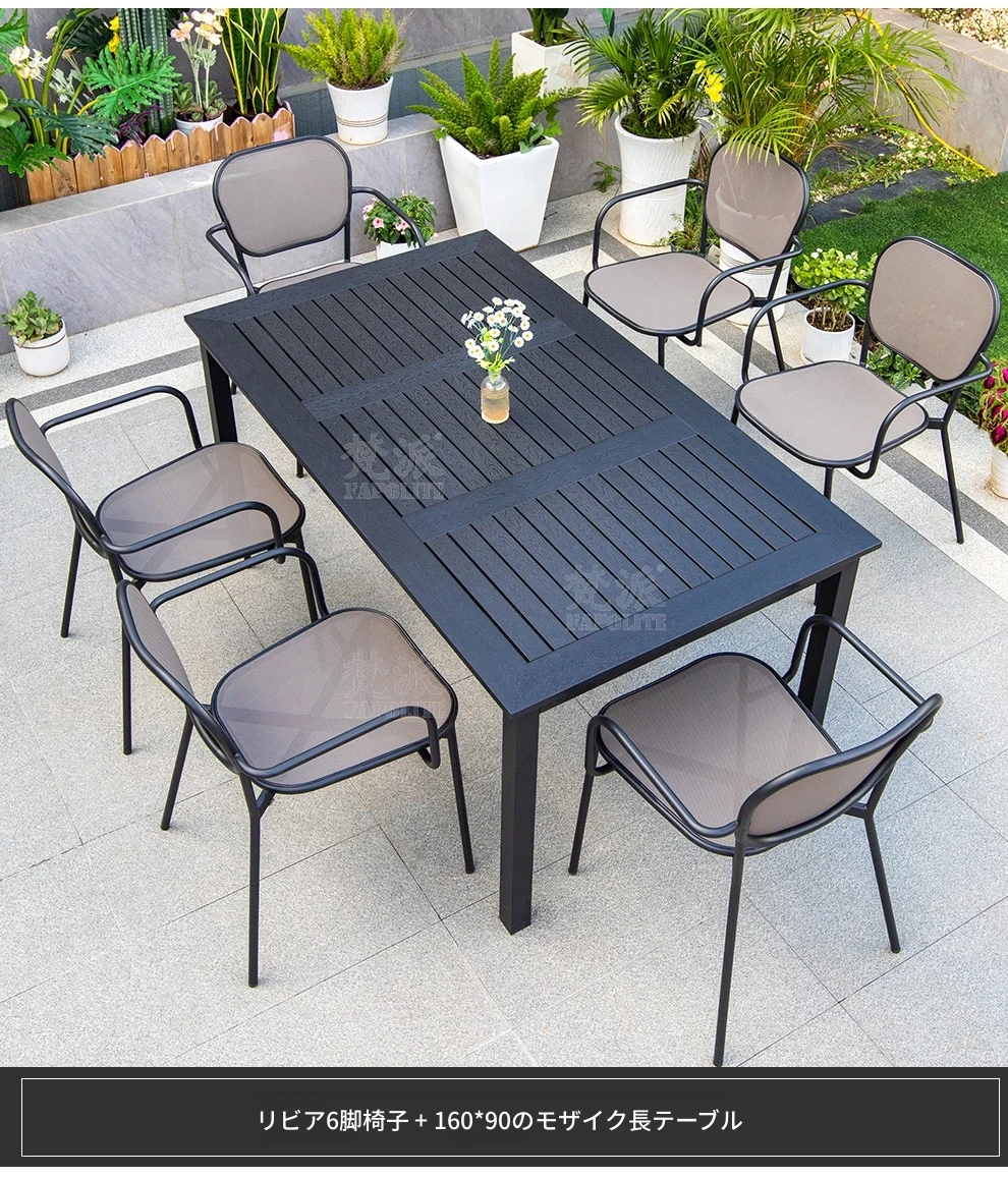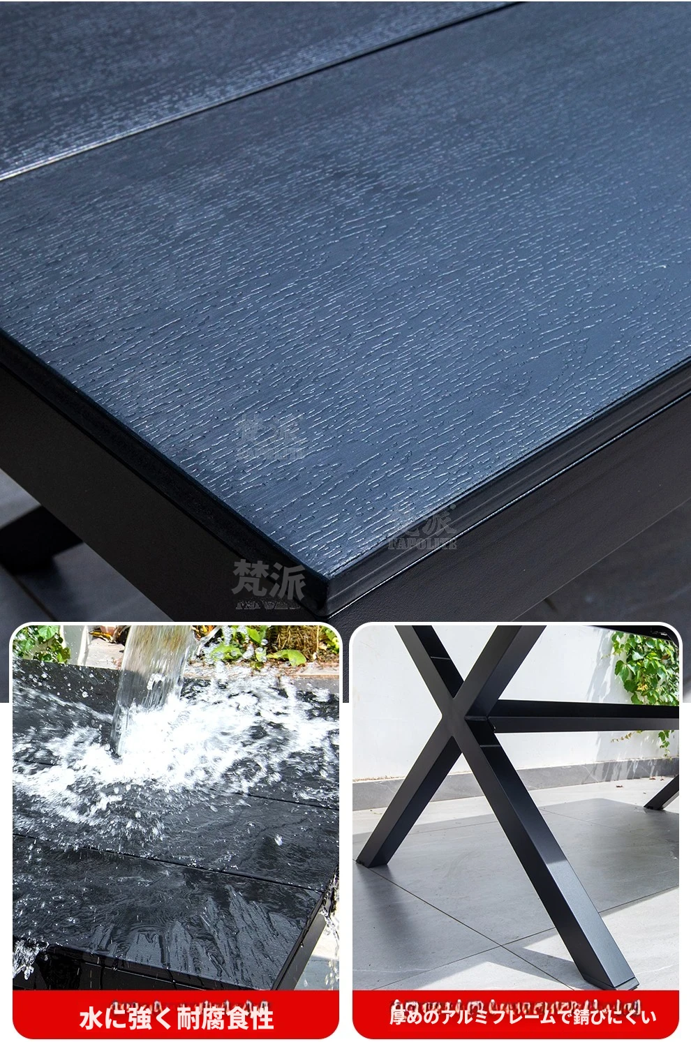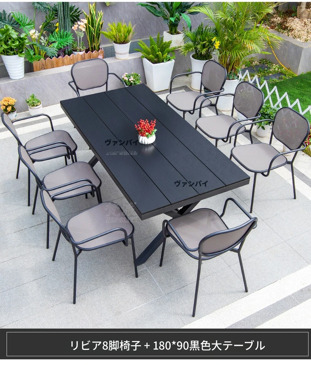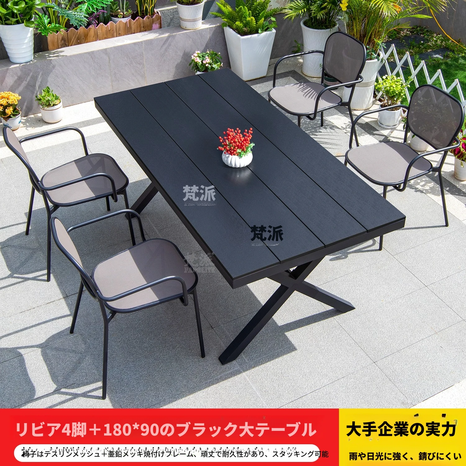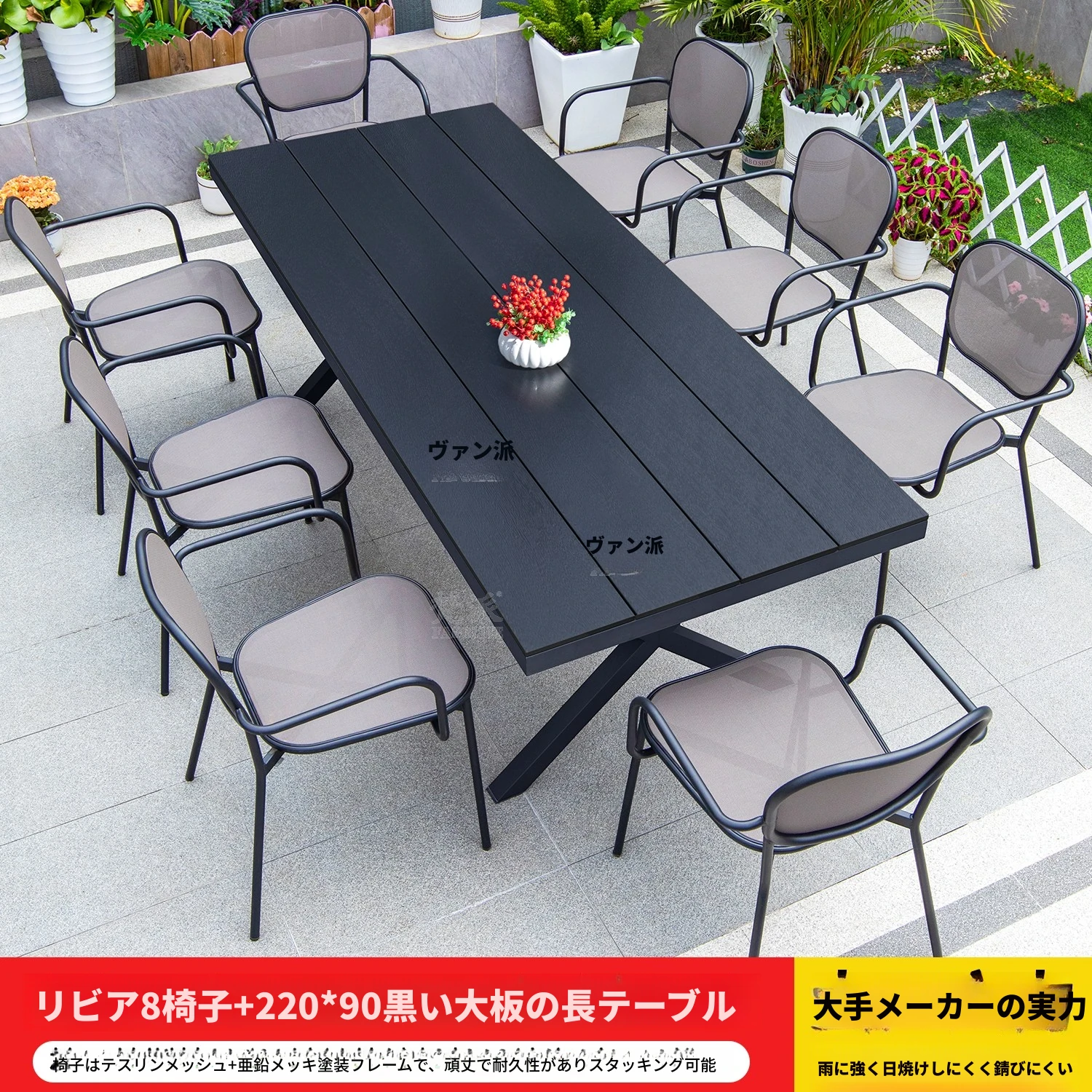 アウトドア用プラスチック木材テーブルセット!耐久性に優れたカーボンスチール製のアイアンテーブルと背もたれ付きの商業用椅子の組み合わせ。防水仕様で、どんな天候でも安心してご使用いただけます。おしゃれで機能的なデザインで、庭やバルコニーに最適です!