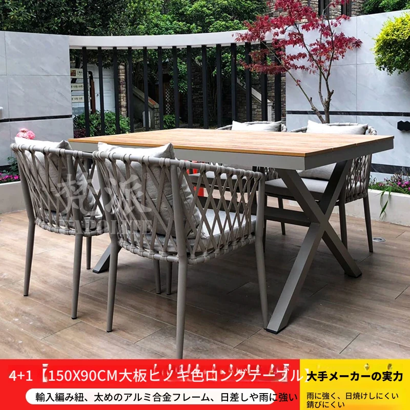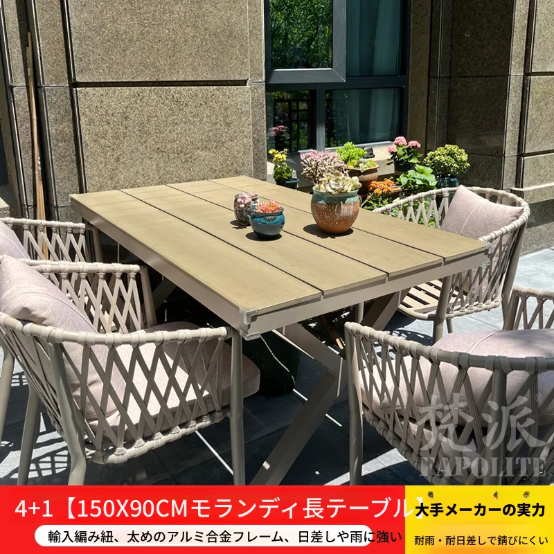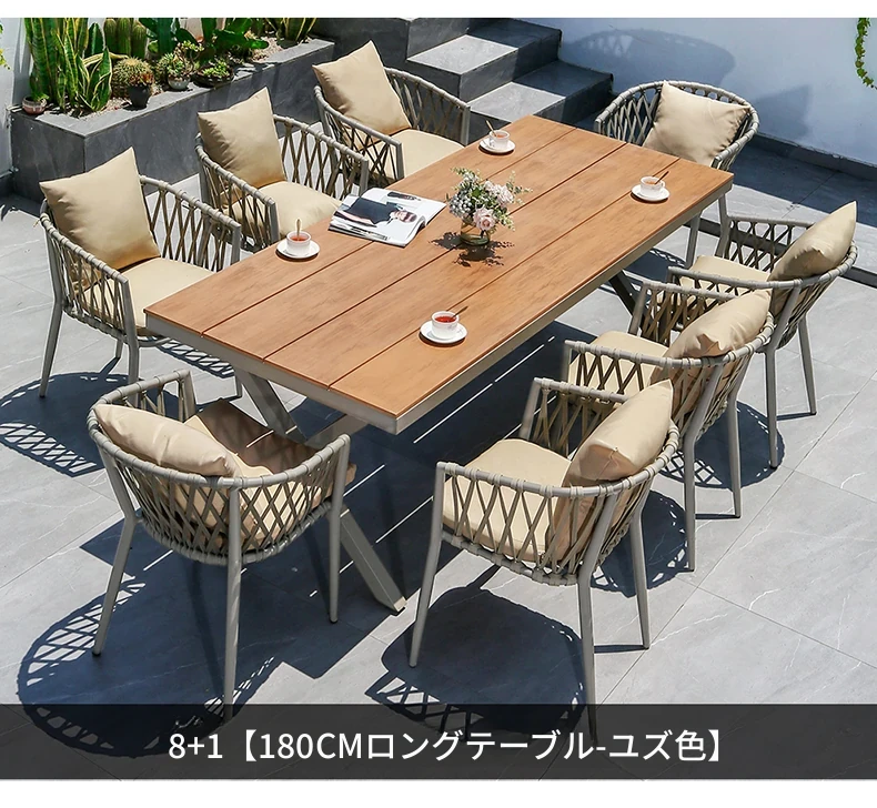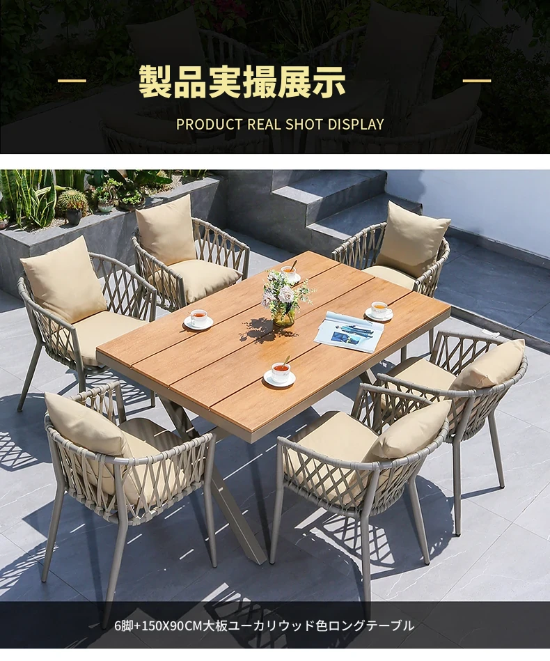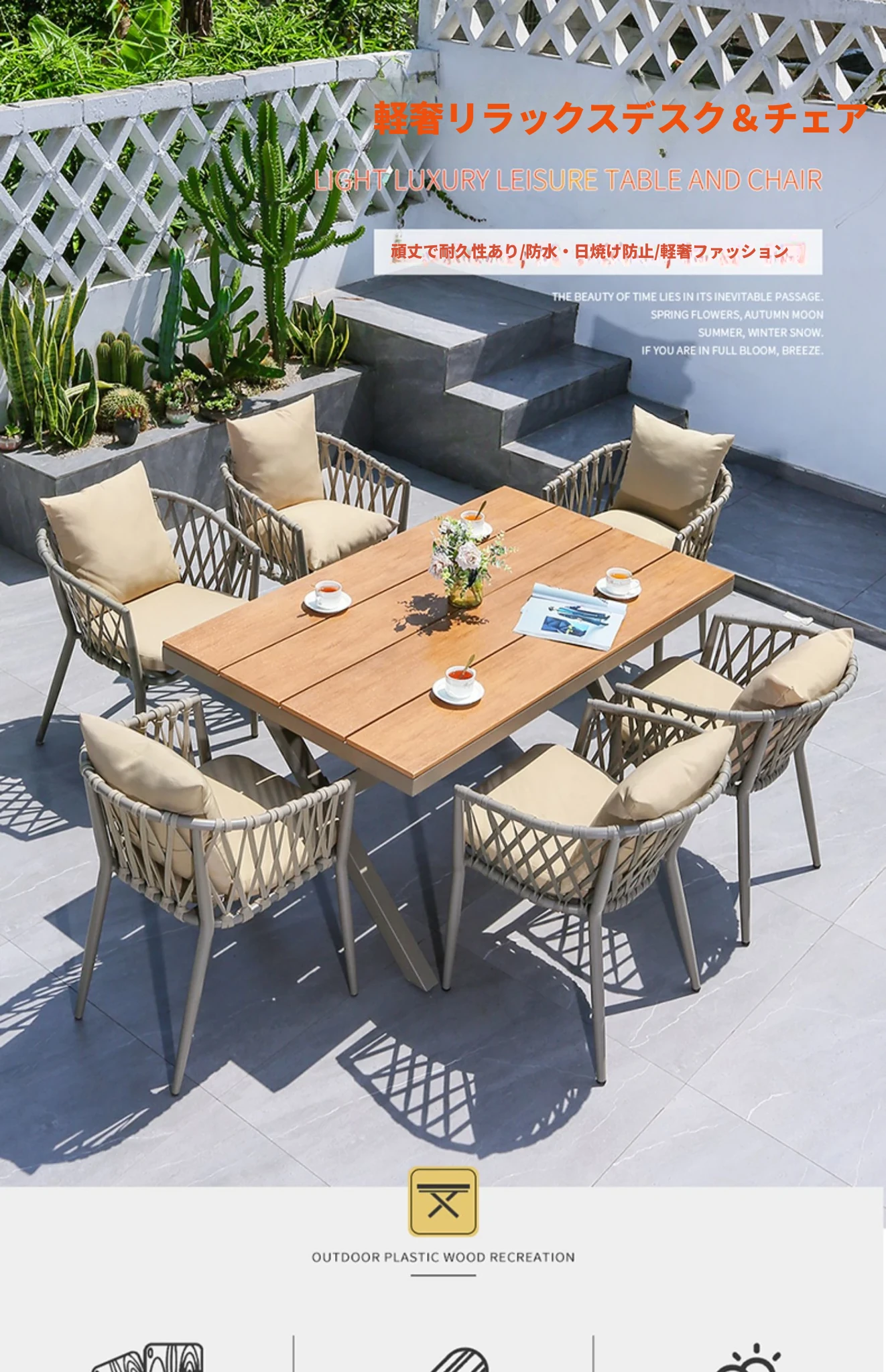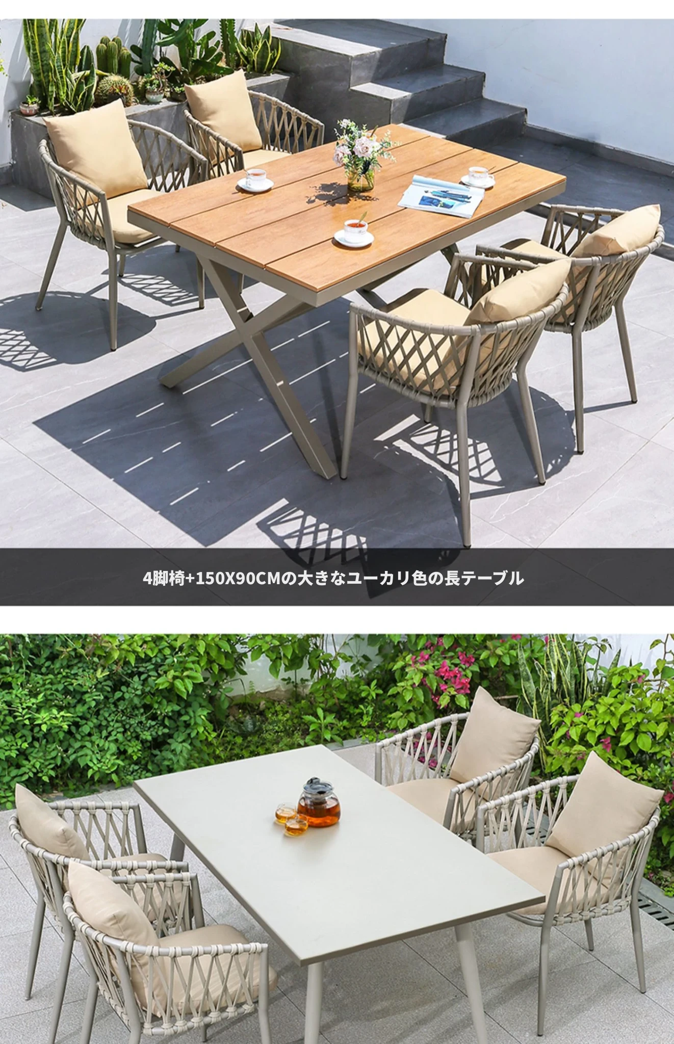 防水機能付き庭用アウトドアテーブルセット!リラックスできる民宿テラス用、ロープ編みの長方形プラスチック木製ダイニングテーブルとラタンチェアのコンビネーションで、快適な時間をお楽しみください!