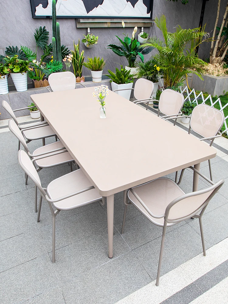 アウトドアパティオテーブル - カーボンスチール製のスタイリッシュな長方形テーブル!防水・UVカット機能付き、快適な背もたれとアームレストの椅子とセットで、屋外での食事をより楽しく!おしゃれなデザインで庭を彩ります。