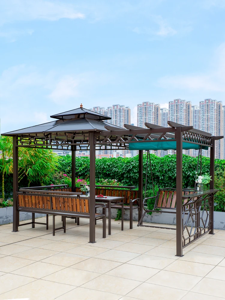 アウトドアパビリオン|庭や別荘に最適!耐候性のウッドデッキと日差しを遮る屋根付きシーリング、快適な秋千付き。防水・紫外線カットで、贅沢なひとときを提供します!